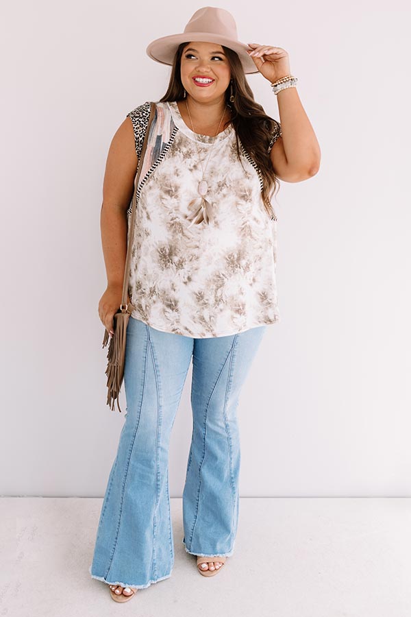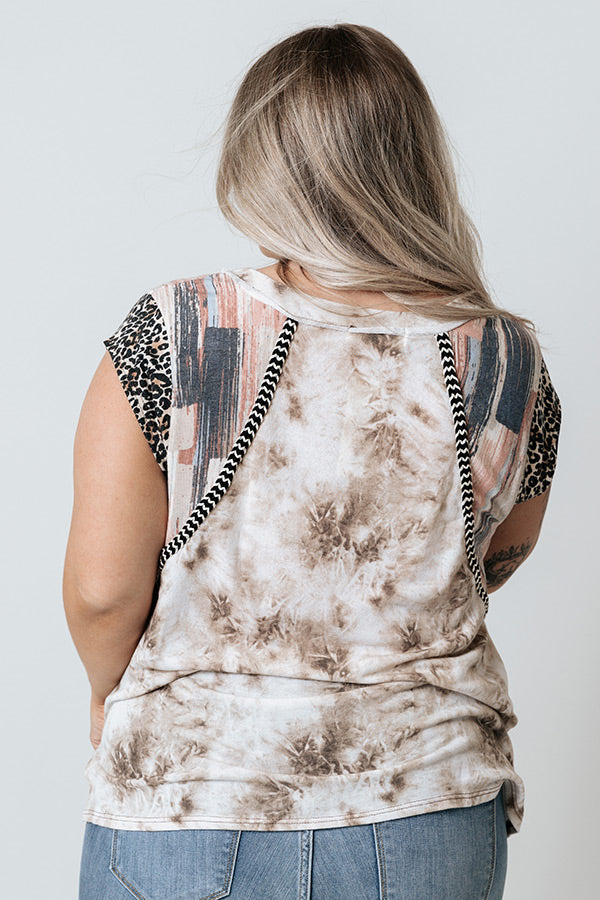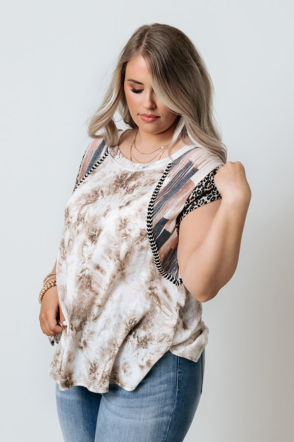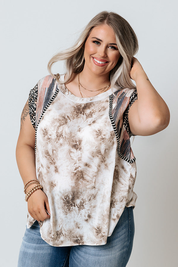 Plus Size - Stroll through summer in style with this unique shift top featuring lightweight brown tie dye material, a high scooped neckline, short loose sleeves patterned with navy and blush hued accent stripes and a black leopard print, and a relaxed silhouette that falls into a straight hemline with side slits! Measurements