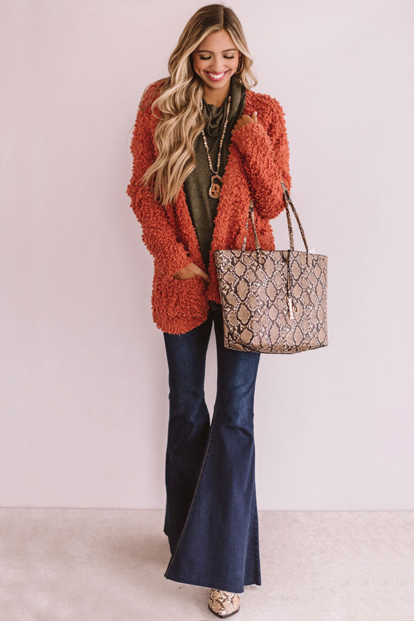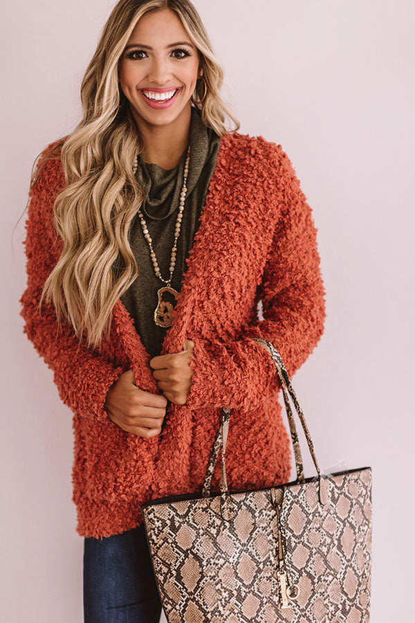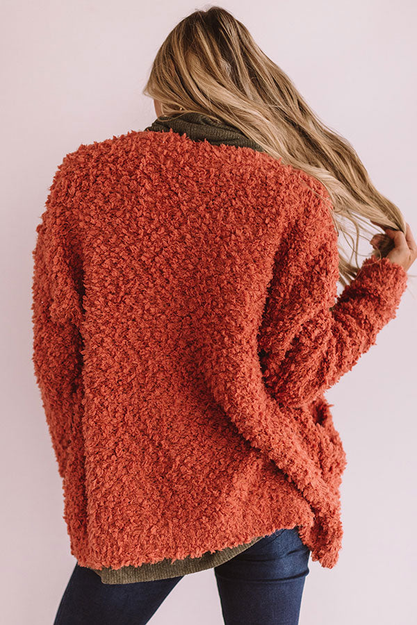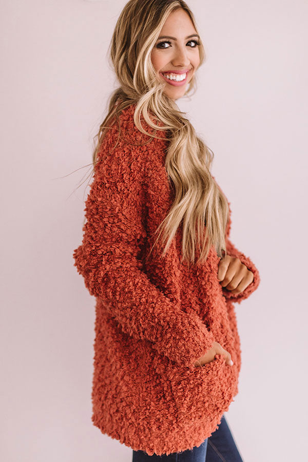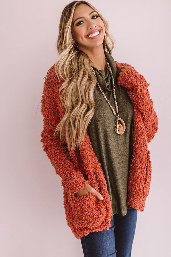 Add a finishing touch and extra bit of warmth to any look with our tangerine colored "Marshmallow Delight" cardigan featuring soft lightweight popcorn knit material, long loose sleeves with more fitted cuffs, low accent side pockets, and a relaxed open front silhouette that falls into a straight hemline!