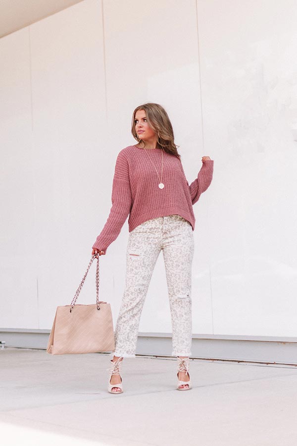 With a sweater this hot, the cold weather doesn't stand a chance! The "Marshmallow Tasty" blush sweater features a soft loose knit ribbed texturing, a high rounded neckline, long sleeves that can be rolled at the cuffs, and a relaxed silhouette that falls into a straight hemline! This versatile fall piece is guaranteed to keep you warm when you style it with some leopard skinnies and a neutral cutout wedge and tote, or you can wear it with our "Magic On Melrose Mini Skirt" and taupe accents like "The Whitley Faux Suede Thigh High Boot" and our "Haute Off The Press Earrings!" Measurements