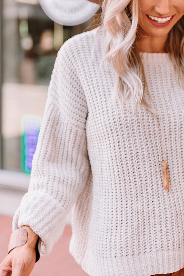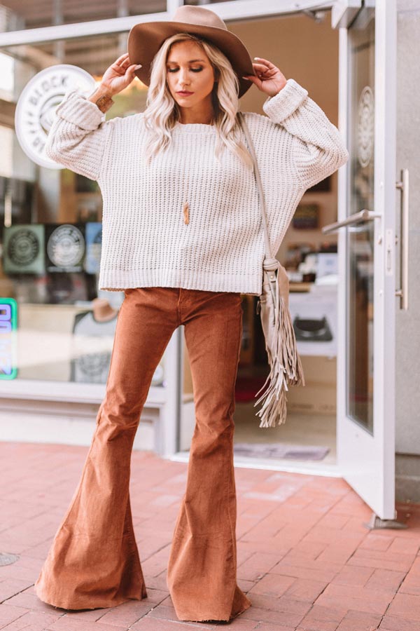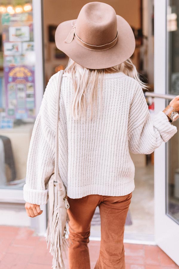 With a sweater this hot, the cold weather doesn't stand a chance! The "Marshmallow Tasty" stone sweater features a soft loose knit ribbed texturing, a high rounded neckline, long sleeves that can be rolled at the cuffs, and a relaxed silhouette that falls into a straight hemline! This versatile fall piece is guaranteed to keep you warm when you style it with some copper corduroy flares, a faux suede hat, and a fringe crossbody, or you can wear it with our "Sweet Victory High Waist Corduroy Skirt in Wine" and taupe accents like "The Whitley Faux Suede Thigh High Boot" and our "Haute Off The Press Earrings!" Measurements