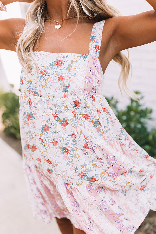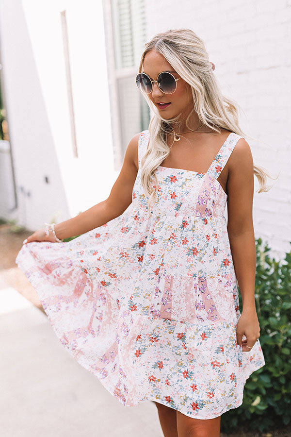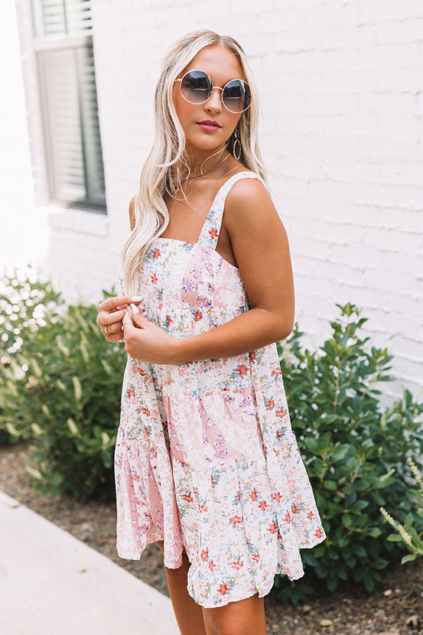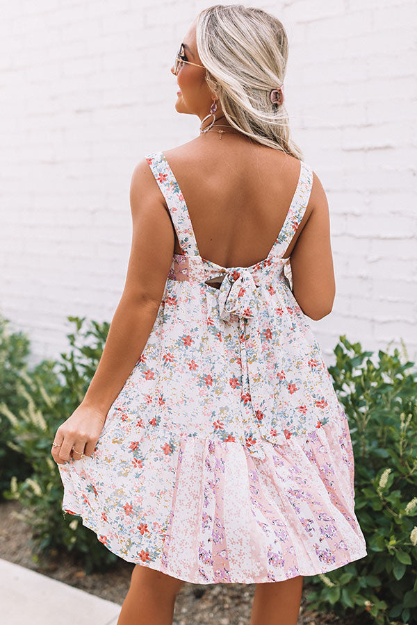 Arrive to brunch in style with this adorable dress featuring lightweight breezy material patterned with a pink hued floral print, a square neckline with wide sleeveless shoulder straps, a mid cutout back with a tie closure, and a relaxed silhouette that falls into an uneven mid-thigh length hemline! Measurements