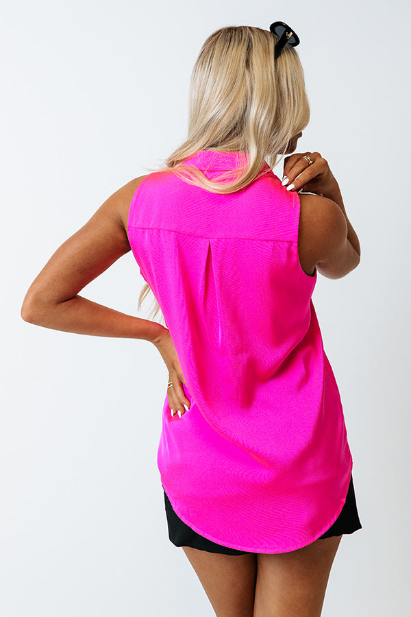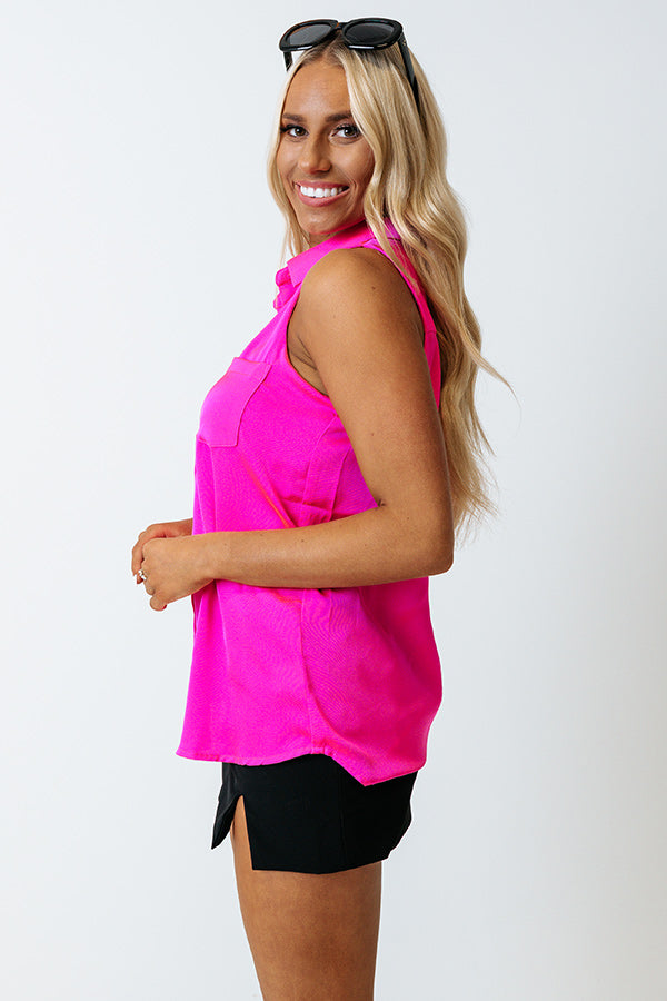 Spend your summer nights in style in this chic hot pink shift top featuring lightweight material, a button down front with a collared neckline, wide sleeveless shoulder straps, a single accent chest pocket, and a flattering silhouette that ends in a rounded hemline! on products