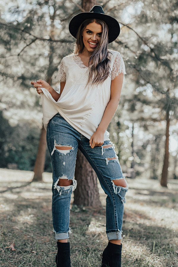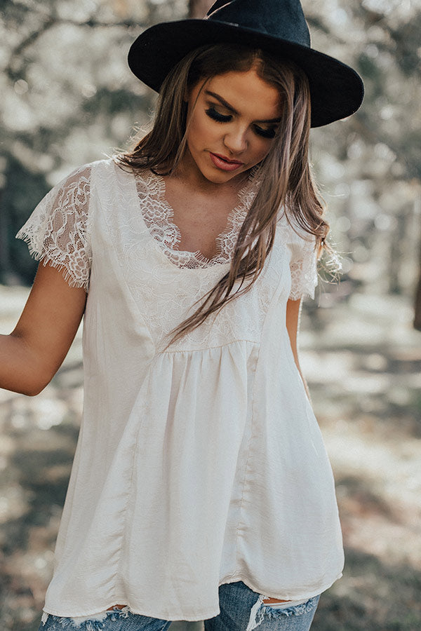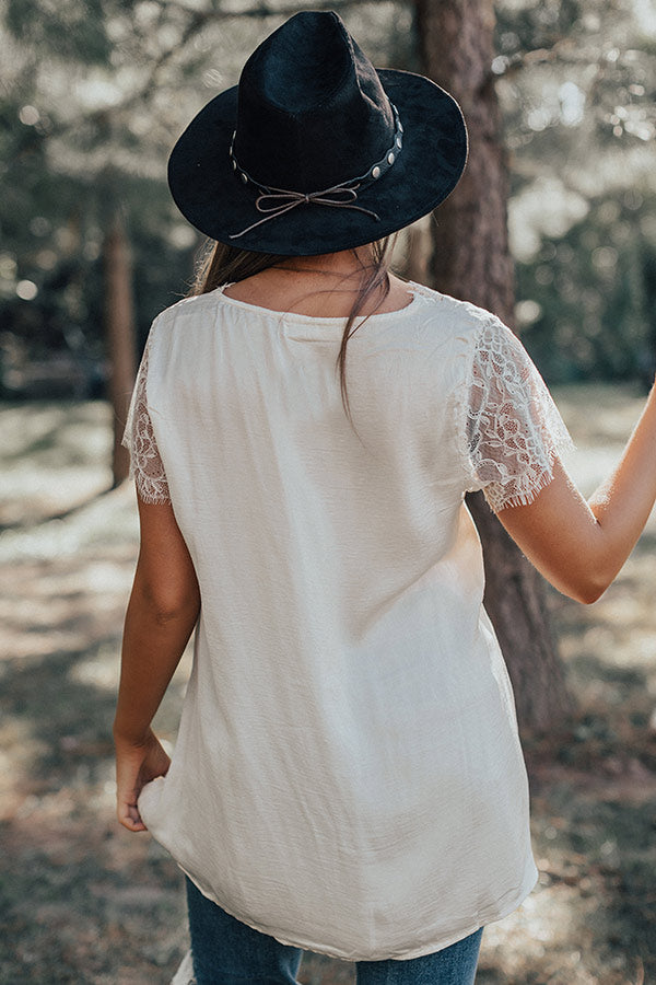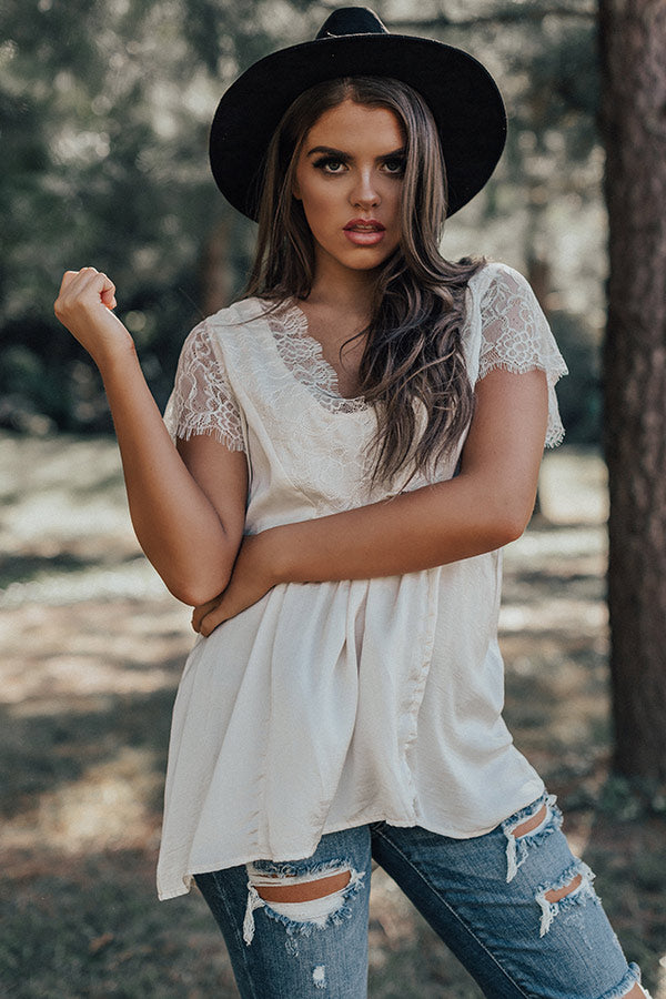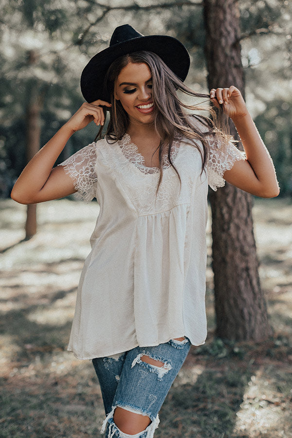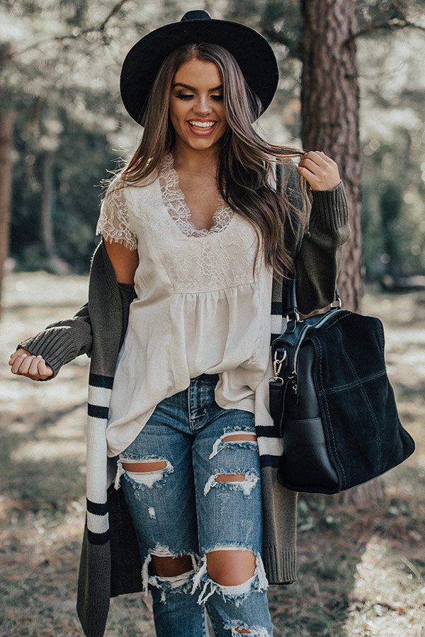 If you are wanting a way to stay stylish and warm while enjoying "martinis in Milan," then this cute cream colored top is perfect for you! It features ultra lightweight satin material, a deep v-cut neckline, intricate lace detailing on the trim and short sleeves, and a relaxed silhouette that falls into a straight tunic length hemline! We have layered this piece under a knit cardigan with some distressed ankle skinnies and a black bootie, tote, and faux suede hat, but you can also wear it with our "Boss Babe Trousers" and "The Jess Faux Suede Heel in Natural" for a fierce working girl look! Measurements