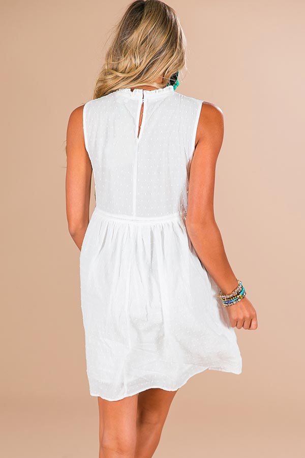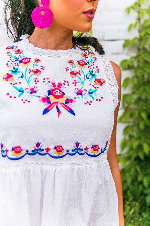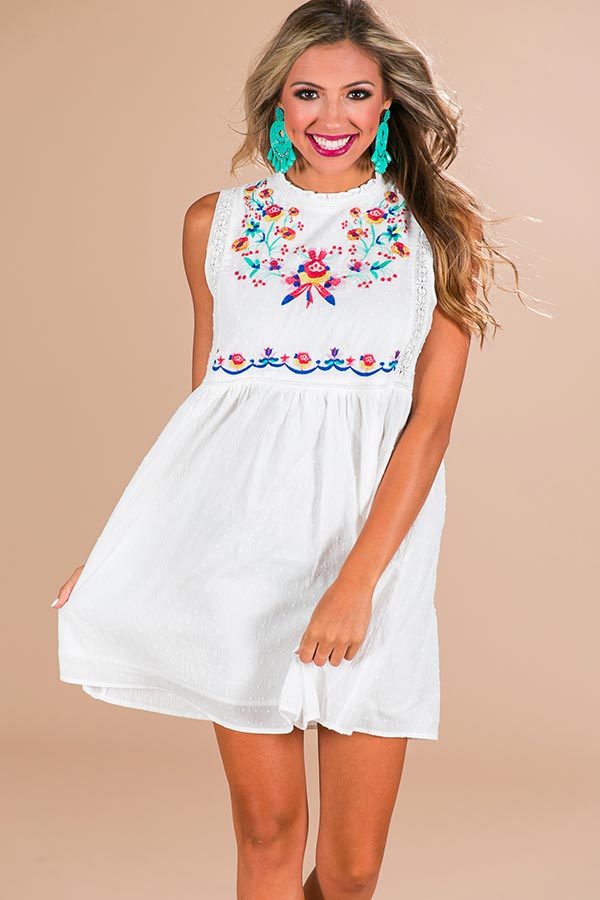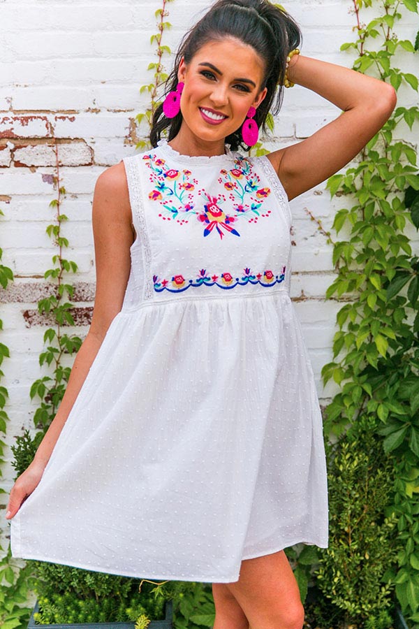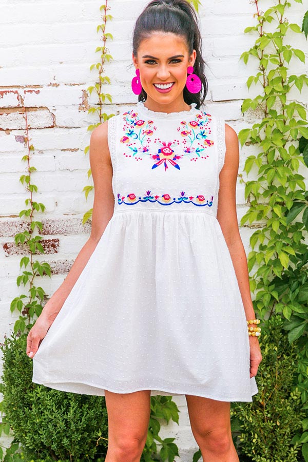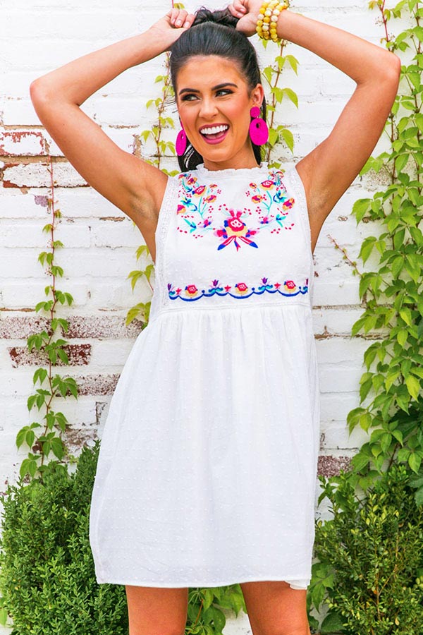 Take on any day in "Maui Embroidered Shift Dress!" This cute closet essential has a v-cut neckline, short flounced sleeves, a relaxed faux button-down poly rayon bodice & a trendy tie-front hem. Just add a few fun statement accessories & your favorite denim, for a "casual cute" look that you will have on repeat all year long! - Hand wash cold. Line dry. - Unlined, but not see through.