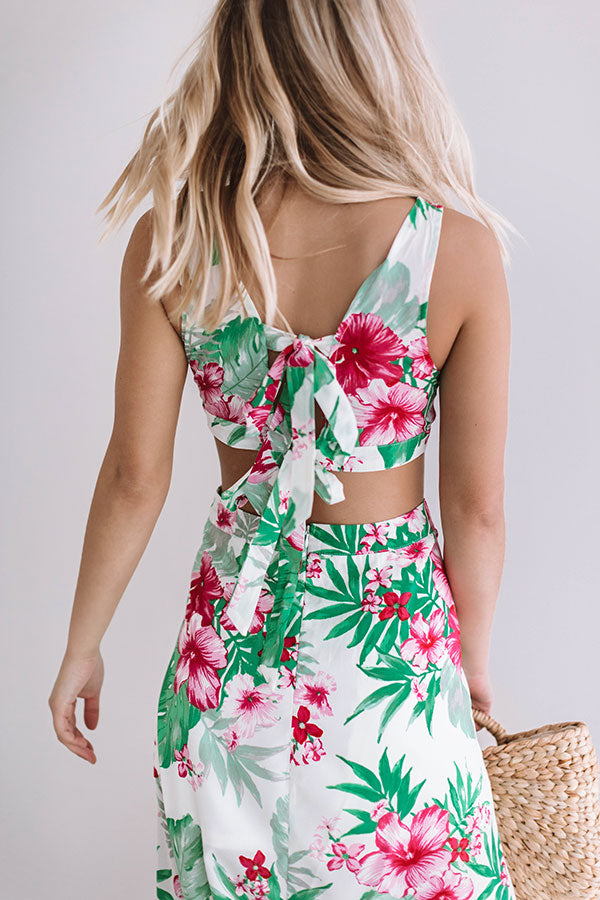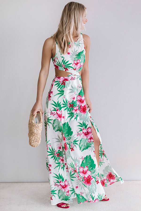 Make a statement in this lightweight floral maxi dress! With a scooped neckline & tie-back top for a flattering fit, this maxi falls into a cutout waist line & a double side slit maxi skirt.