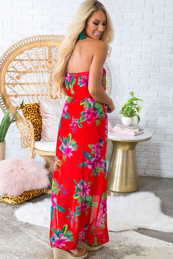 This botanical beauty is giving us major vacay vibes! This vibrant red floral printed strapless maxi dress features an elastic banded top & waistline, a flirty front slit & a silky semi-sheer chiffon skirt that's worthy of a 1st class ticket to paradise!