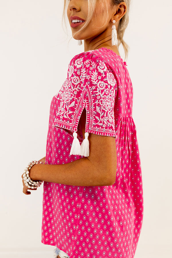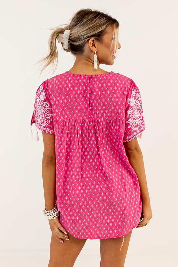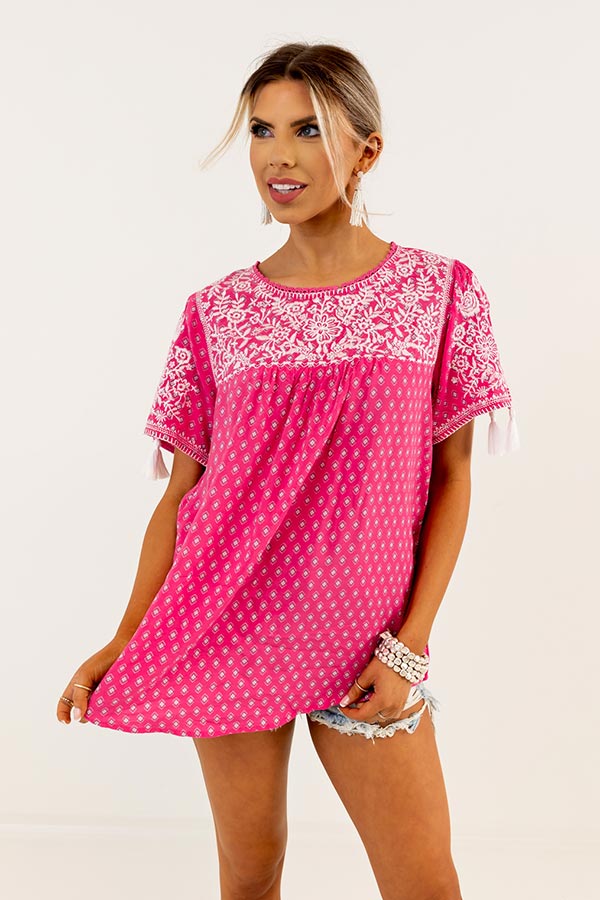 Brighten up you day with our vibrant pink 'Maui Please' top featuring lightweight flowy material patterned with a small diamond like print and gorgeous white embroidered floral detailing, a high neckline, short sleeves with v-notches and tassels, a keyhole accented upper back with a button closure, and a relaxed silhouette that falls into a rounded hemline!