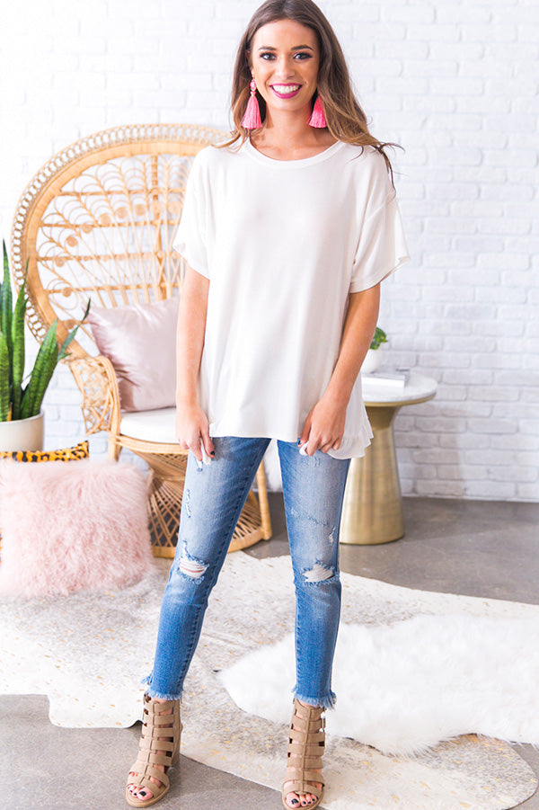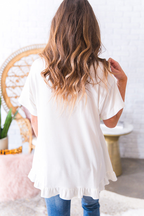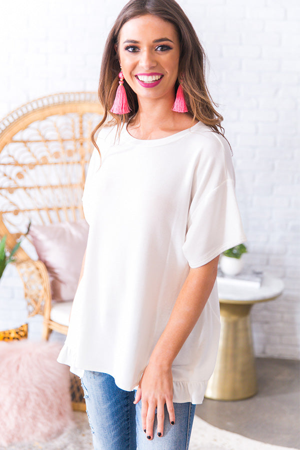This comfy cutie has a round neckline, short sleeves & an ultra cozy shift bodice with a ruffle-accented high-low bottom hem. Style with your favorite denim for a "casual cute" look you're sure to have on repeat all season long!