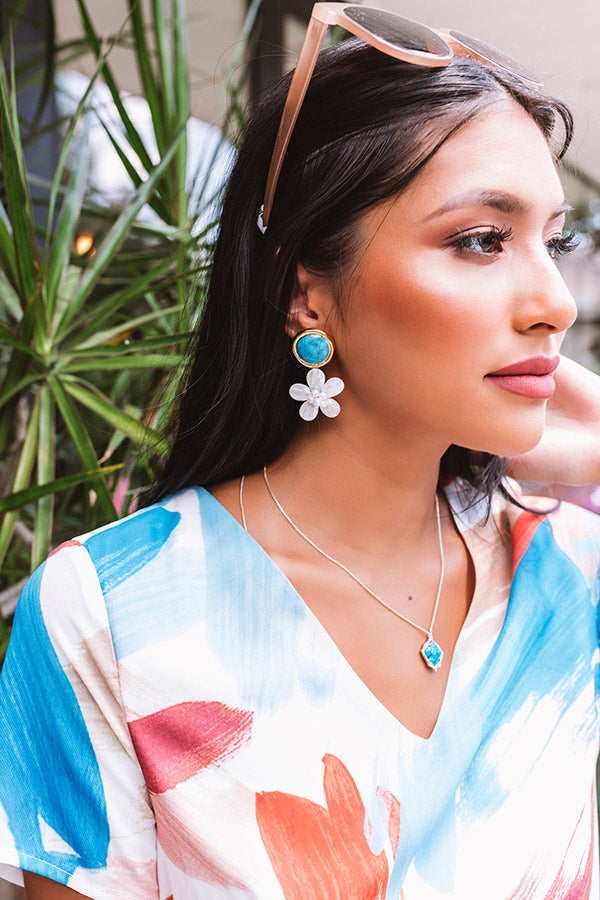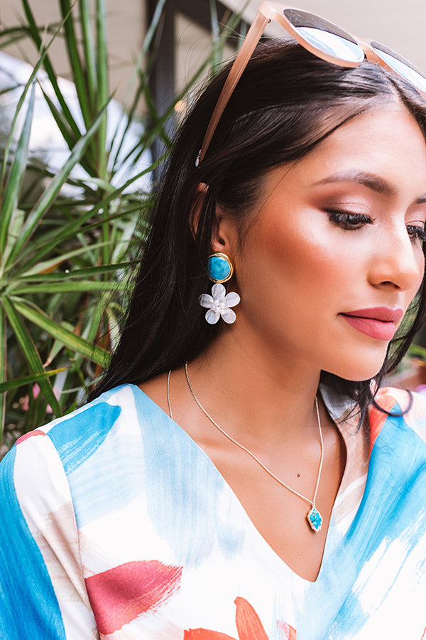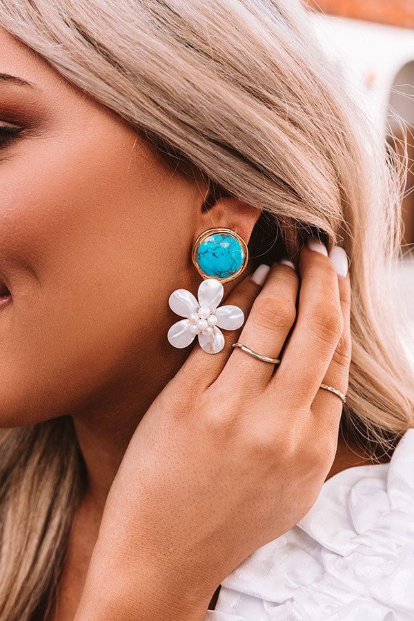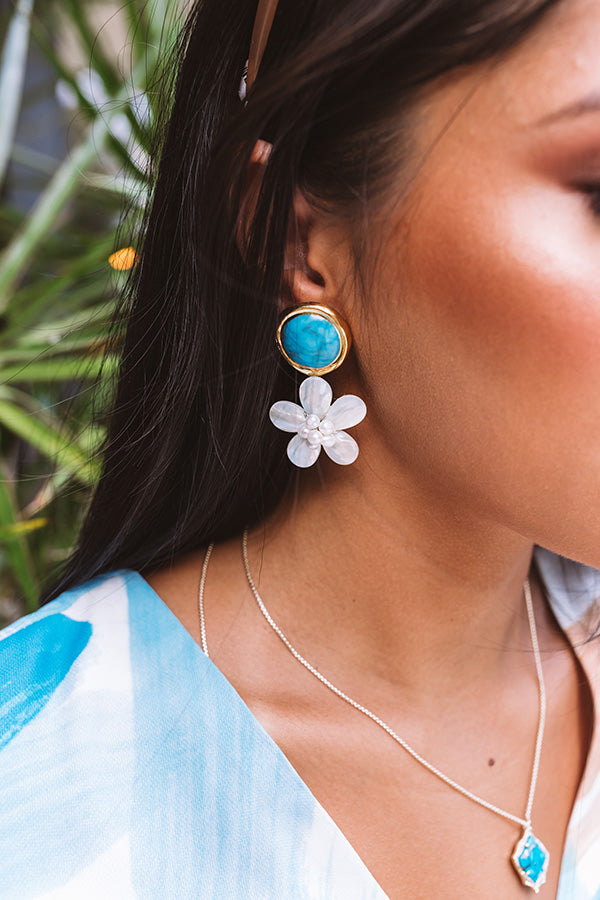 Leave a little sunshine wherever you by accessorizing with these adorable statement earrings featuring large rounded turquoise faux stone studs set in gold trim and dangling white flowers with pearl accents!