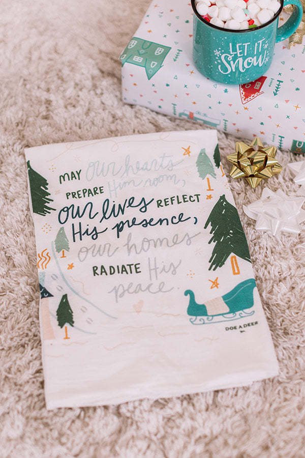 Be sure all the rooms in your house are decorate for Christmas, even your kitchen with our adorable white 'May Our Hearts Prepare Flour Sack Towel' featuring adorable blue/green hued lettering and a cozy tree and sleigh graphic! PLUS, this cutie is sized at 28x29 and machine washable!