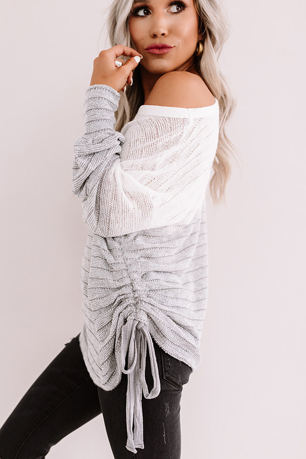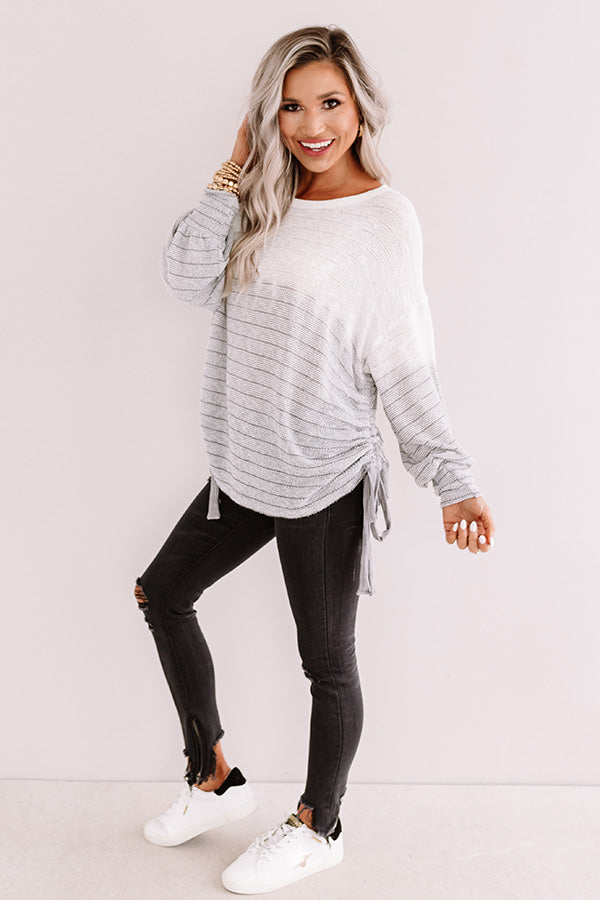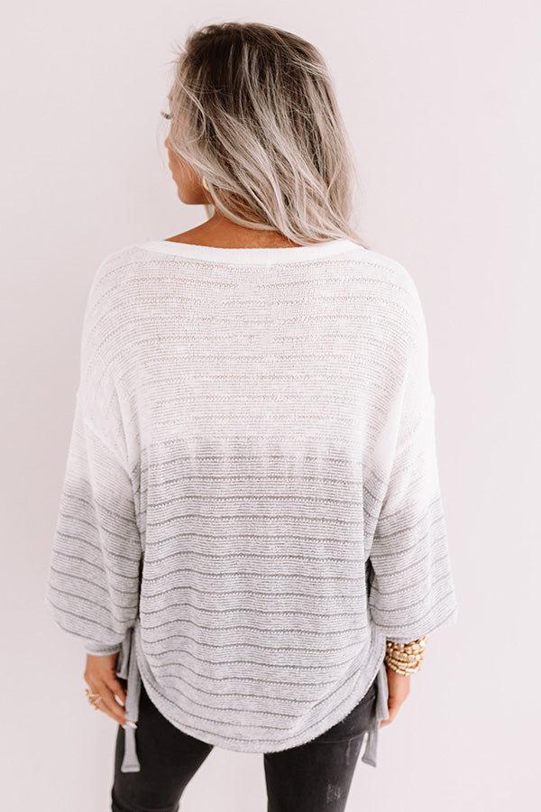 We guarantee you'll look photo worthy in our adorable "Me, My Selfie, And I" shift top featuring soft lightweight tight knit material with white to grey ombre coloring, horizontal accent stripes, a wide rounded neckline, long loose sleeves with fitted cuffs, cinched side details with tie closures, and a relaxed silhouette that falls into a straight hemline! Measurements