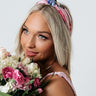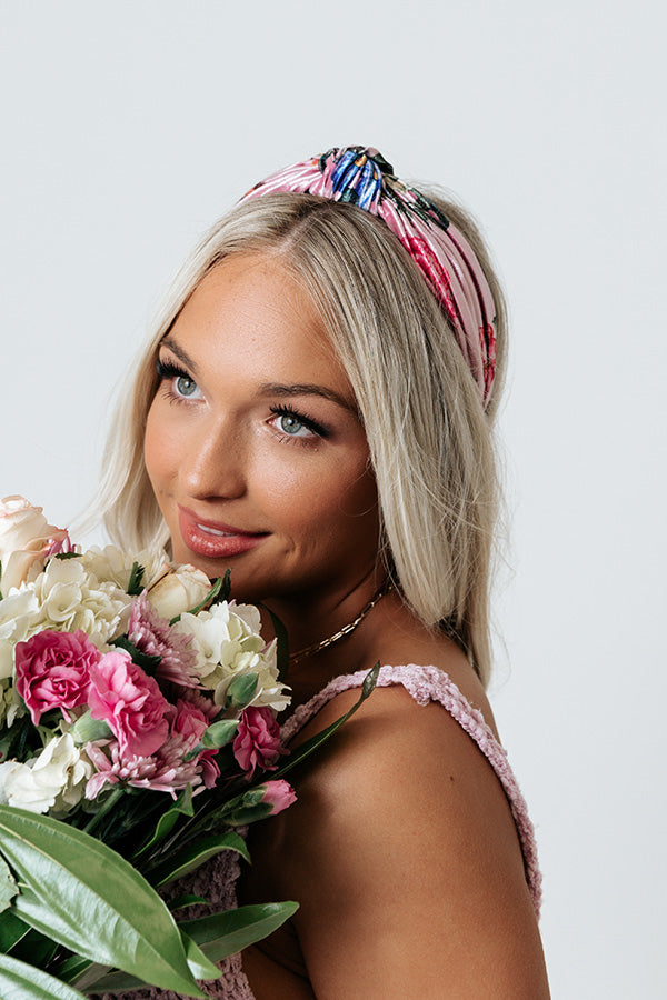 Add a touch of magic to your outfit with this whimsical headband featuring pink velvet material patterned with a cute floral print and an accent top knot!