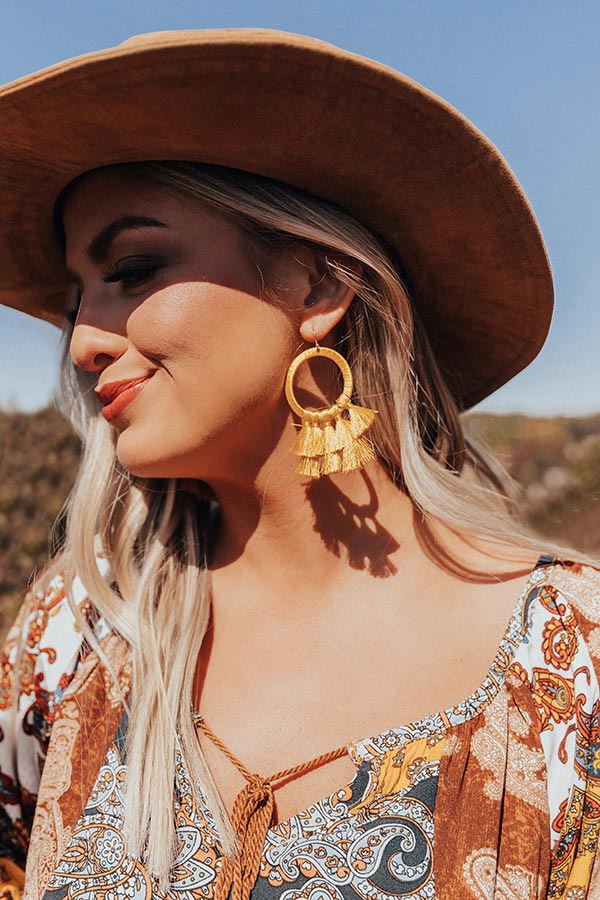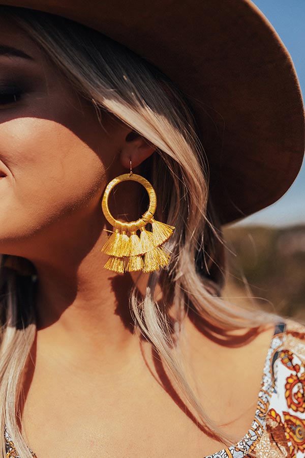 Jewelry is always appropriate! So treat yourself to the "Meant For Margs" statement earrings featuring dangling hoops with tiered marigold colored tassel charms!