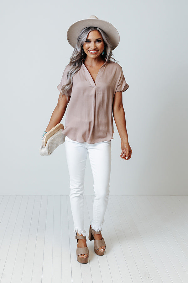 This adorable dusty purple colored top is meant to be worn when drinking martinis with your besties! It simply features a sleek lightweight satin material, short loose sleeves with notched detailing, a collared v-cut neckline that can be worn off one shoulder, and an ultra relaxed silhouette that falls into a straight hemline! Measurements