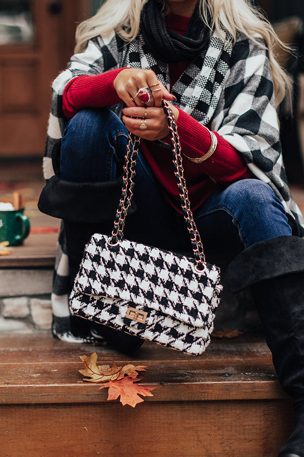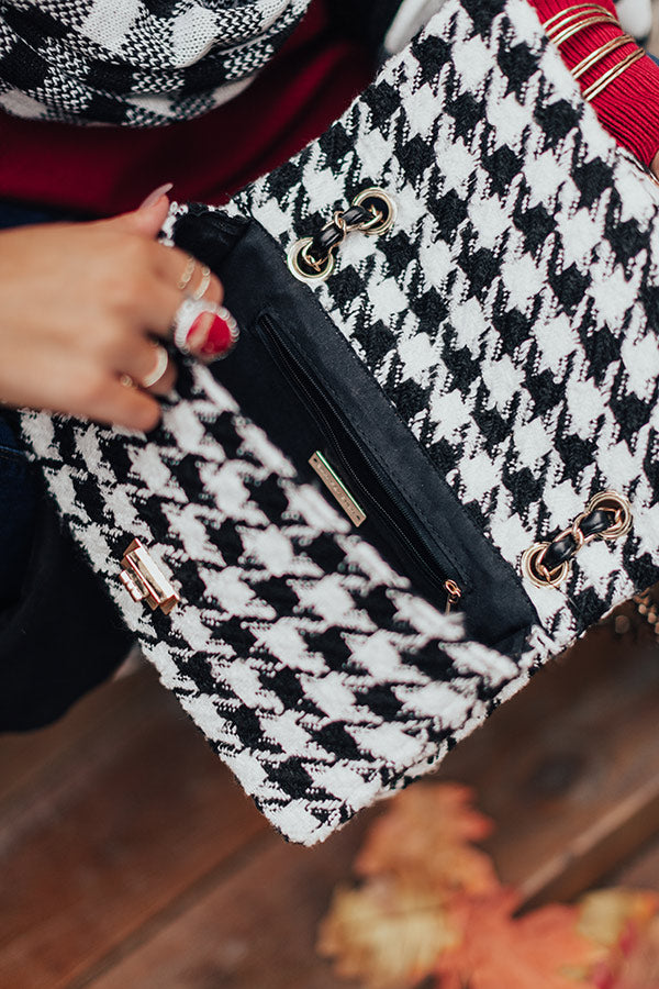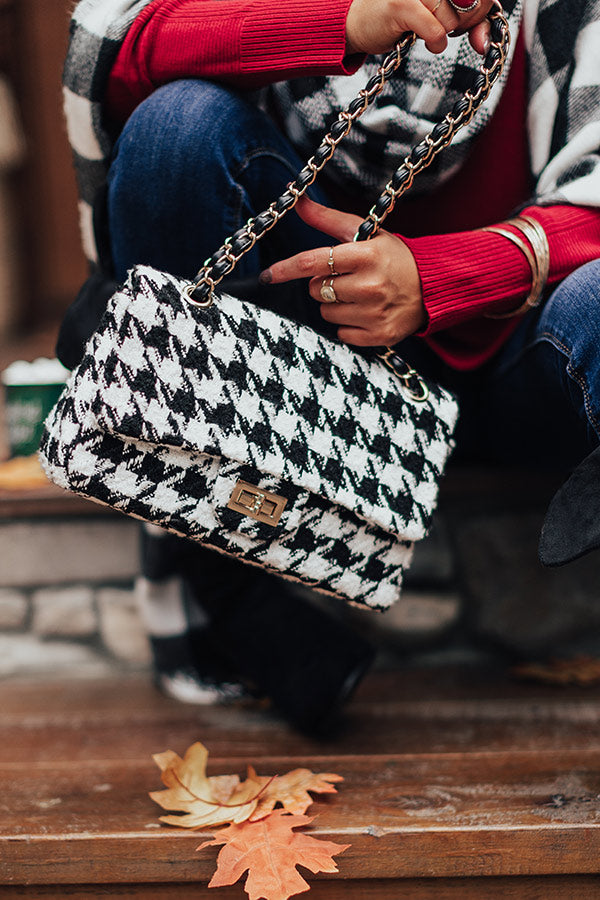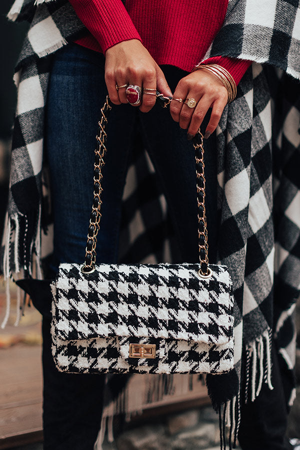 You and this chic crossbody are "meant to be" with its stunning white and black houndstooth pattern, a gold chain link handle that can be worn long as one strap or shorter as two straps, a lightweight rectangular silhouette with additional inside pockets, and a flap closure with twist hardware!