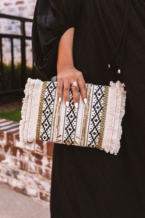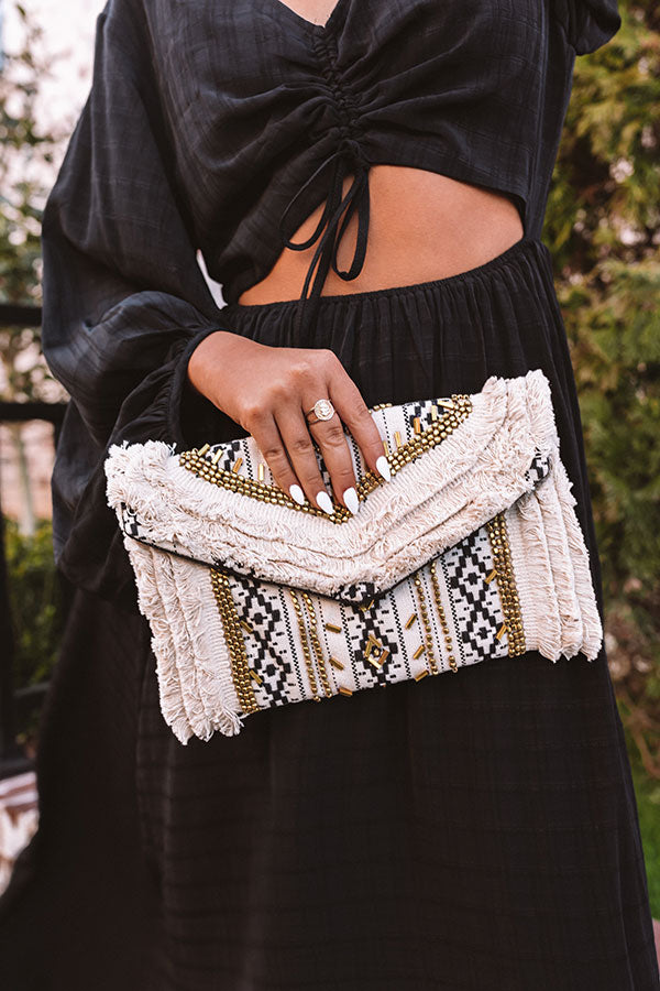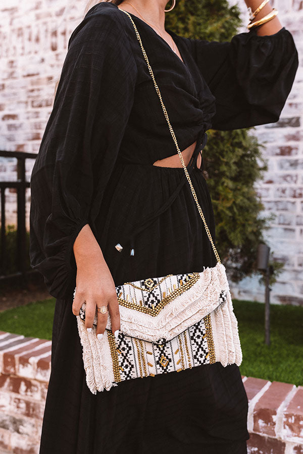 Ladies...meet our cutest new summer crossbody! This fabulous bag features embellished beaded detailing and ivory hued fringe accents, an envelope flap closure with a snap button, and a spacious fully lined pouch with additional inside pockets! PLUS, it has a removable chain link shoulder strap that can also be tucked inside the purse!