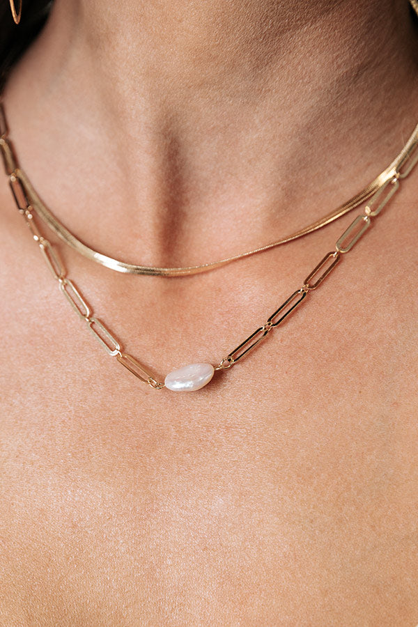 Add a dainty statement to any look with our 'Meet For Tea' necklace featuring two layered gold pieces: a snake chain choker and a longer link chain with a pearl charm!