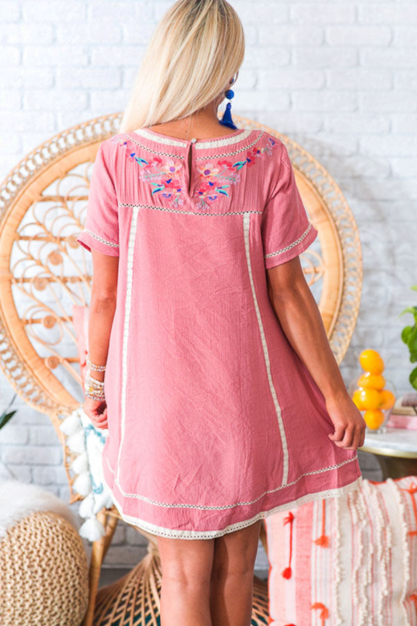 Vacay in style in this chic shift dress! This boho babe has short sleeves, a breezy shift silhouette with gorgeous floral embroidery & ivory crochet pierced details throughout. All you need is a sassy wedge and a paradise destination to pull this look together!