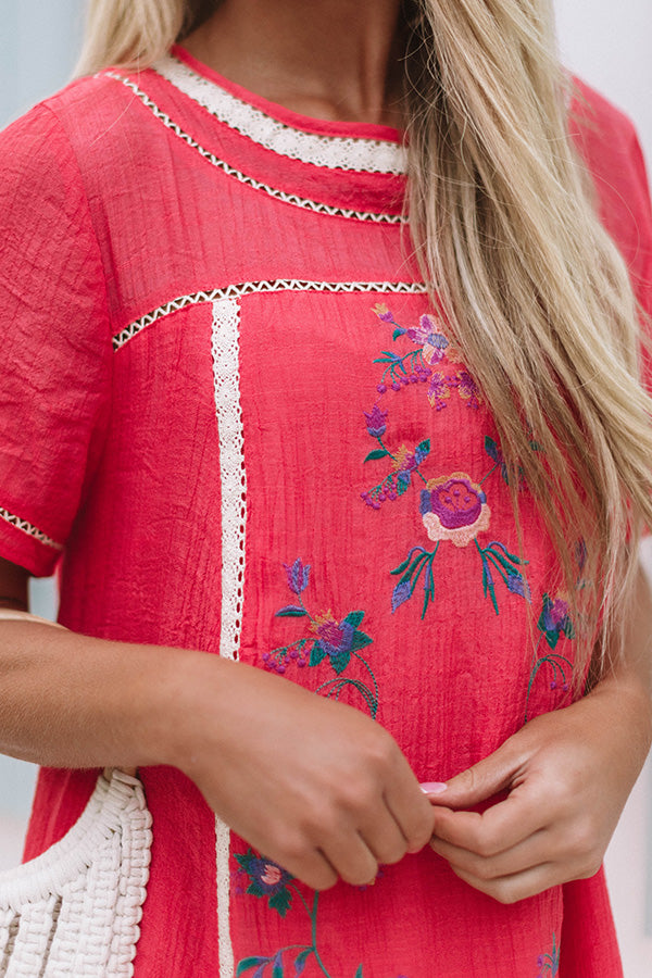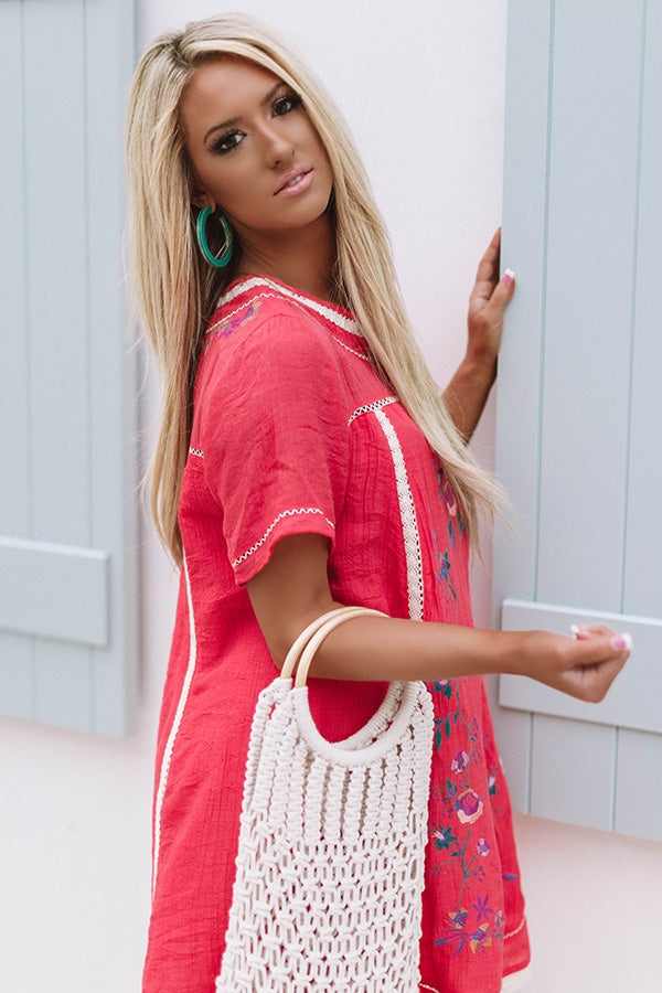 Vacay in style in this chic shift dress! This boho babe has short sleeves, a breezy shift silhouette with gorgeous floral embroidery & ivory crochet pierced details throughout. All you need is a sassy wedge and a paradise destination to pull this look together!