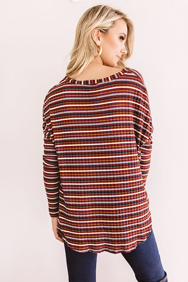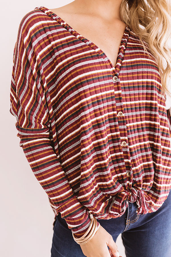 Take in the beauty of the season while donning all your favorite fall hues with the "Meet Me In The Middle" top featuring a colored stripe pattern, lightweight stretchy material, subtle vertical ribbed texturing, long fitted sleeves, a button up bodice with a wide v-cut neckline, and a relaxed silhouette that falls into a tied front hemline and a rounded back hem! We have styled this chilly weather essential with some dark denim flares and a neutral pointed bootie, but you can also wear it under our "Cider Style LightWeight Jacket in Light Khaki" with some distressed black jeans and "The Seraphina Faux Leather Wedge in Taupe!"