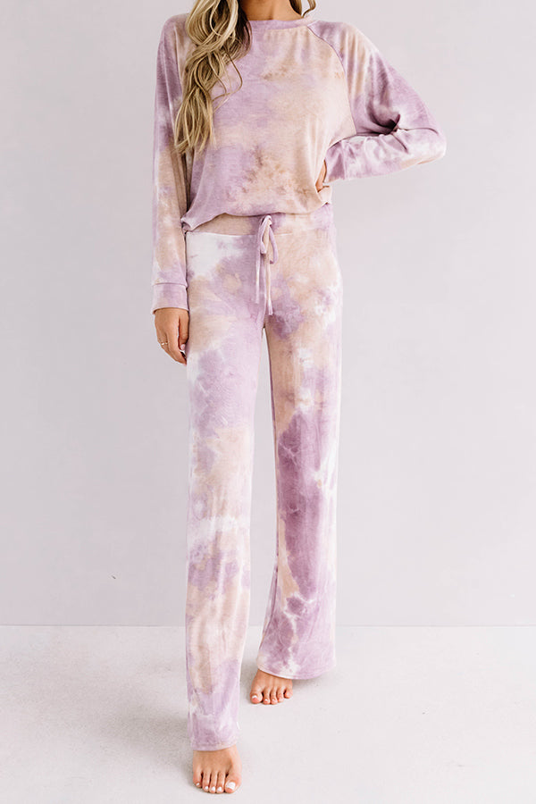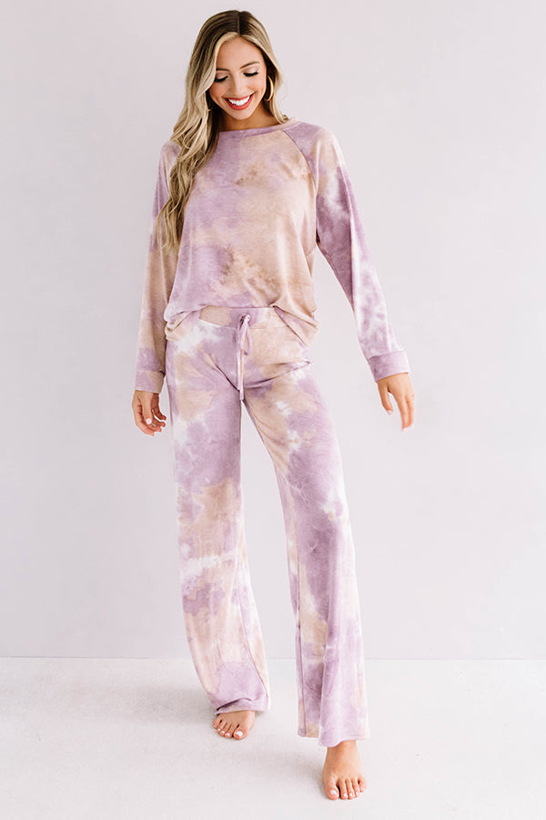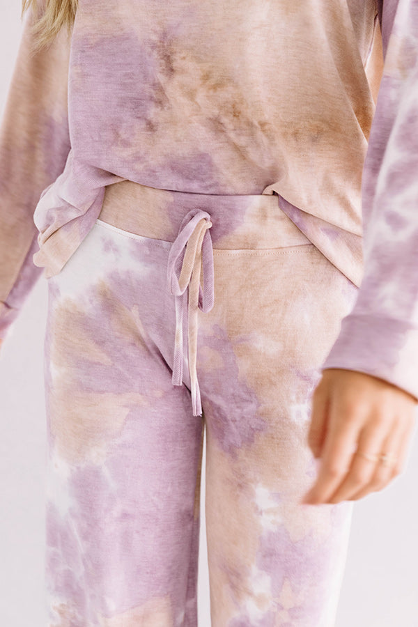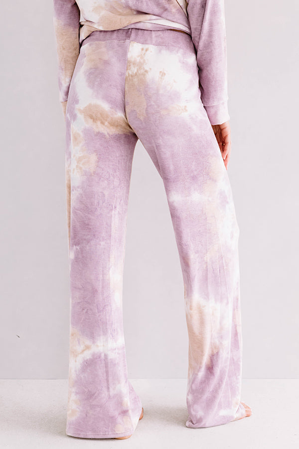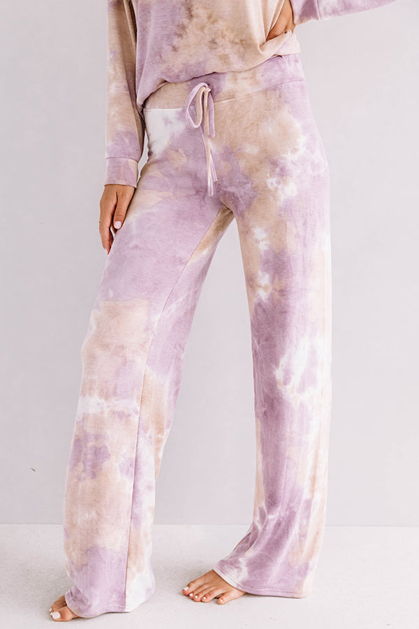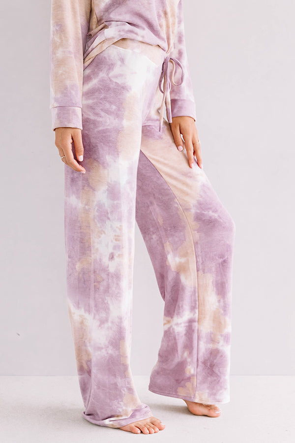 You won't find a better piece to enjoy a "mellow morning" in than these darling pants featuring soft lightweight material patterned with purple and gold hued tie dye, a wide elastic waistline with a tie belt, and a relaxed silhouette that falls into straight floor-length hemlines! This comfy piece styles perfectly with our matching "Mellow Morning Tie Dye Sweatshirt," a scrunchie, and some fuzzy slippers for the ultimate two-piece lounge look! Measurements