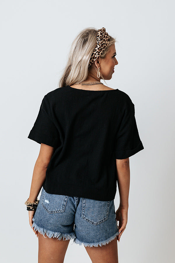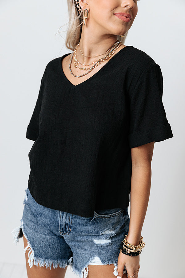 People will be sure to memorize your smile and amazing style when you complete your look with this casual black top featuring lightweight material, a scooped v-cut neckline, short loose sleeves, and a relaxed silhouette that ends in a straight hemline! Measurements