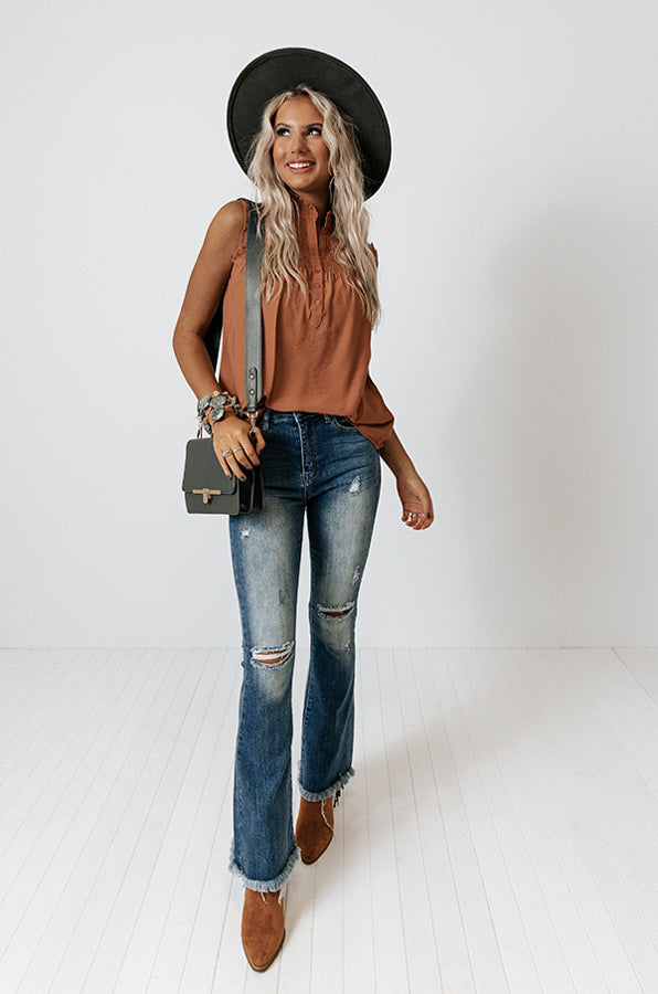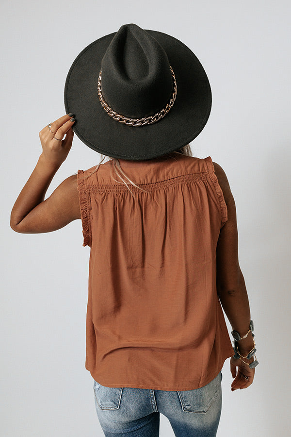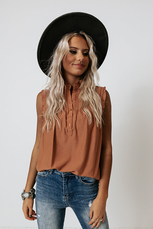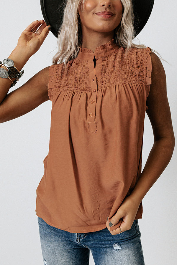 This light rust shift top will have you dreaming of merlot and magic with its lightweight material, buttoned up smocked bodice with a rounded collar, sleeveless shoulders with ruffle trim, and an ultra breezy silhouette that falls into a rounded hemline!