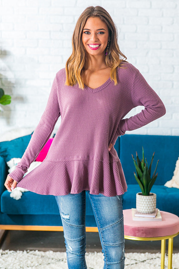 Pour a glass of merlot, this waffle knit top is ready to cozy up fireside and unwind. The "Merlot At The Lodge Knit Top" has a v-cut neckline, long fitted sleeves, and an ultra soft relaxed waffle knit bodice with a flounced babydoll hem. A modern twist to an all time fave, this knit top combines the classic waffle knit bodice you know and love with a feminine flounced hem, to create your new favorite fall basic!
