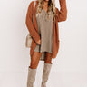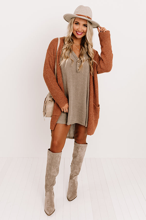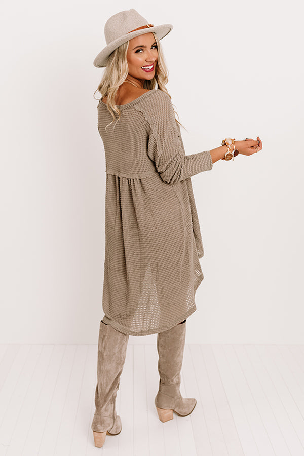 Enjoy a glass of Merlot with the girls in style with this casual cute dark taupe colored dress featuring lightweight flowy material with waffle knit texturing, a button up bodice with a v-cut neckline, exposed accent seams, long loose sleeves, and a relaxed silhouette that ends in an uneven mid-thigh length hemline! Measurements