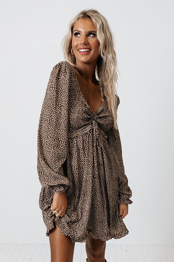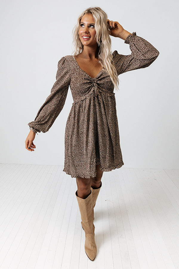 You are sure to receive endless compliments when you arrive in our pretty brown 'Merlot On My Mind Dress' featuring lightweight flowy material patterned with a tiny light natural hued leaf print, a v-cut neckline with a smocked cinched tie closure bodice, long loose sleeves with ruffle cuffs, a square upper back, and a relaxed skirt silhouette that falls into a ruffled mid-thigh length hemline! Measurements