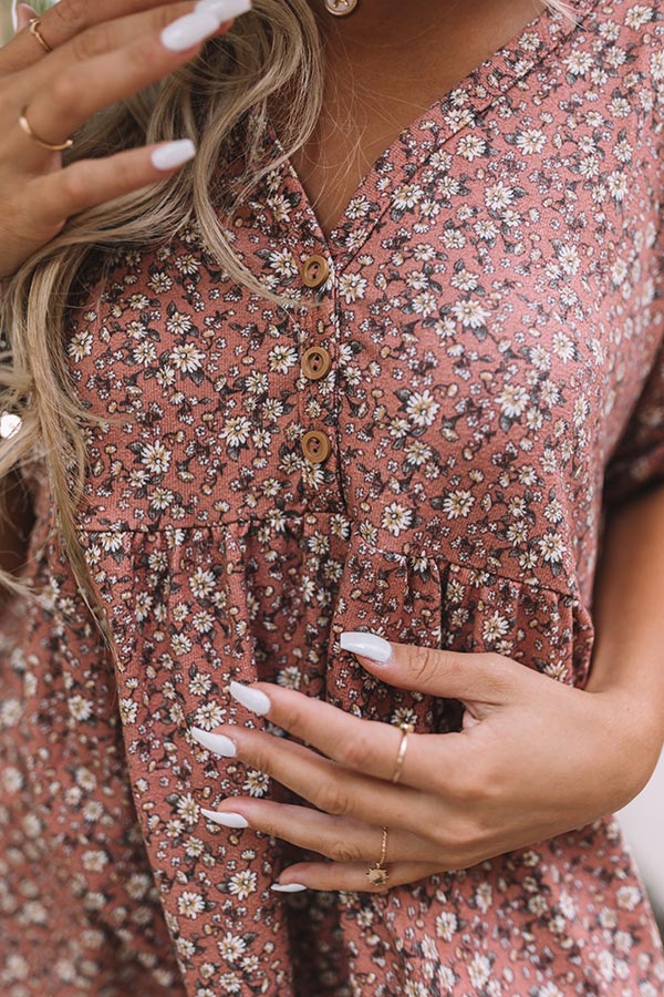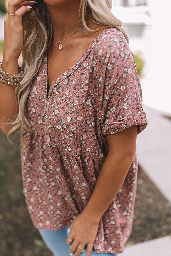 Enjoy some merlot on the patio in style with this adorable blush colored top featuring lightweight flowy material patterned with a darling floral print, a button up bodice with a v-cut neckline, short sleeves with rolled cuffs, and a relaxed babydoll silhouette that falls into a straight hemline! Measurements