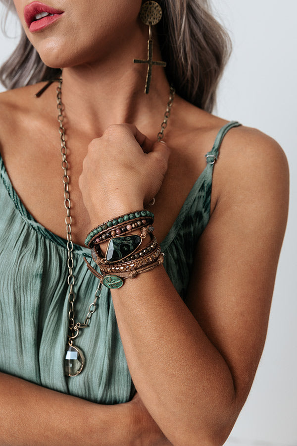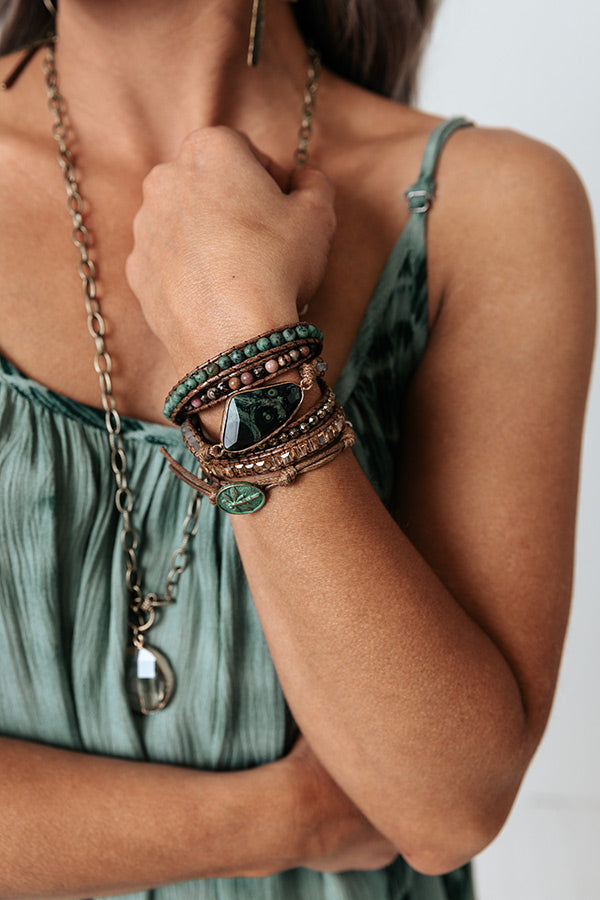 Take your look to the next level with our beautiful 'Mermaid Watch' bracelet featuring a wrap silhouette with earth hued beads and a gorgeous semi precious stone! Due to the use of natural stones, stones may vary in size, shape or color.