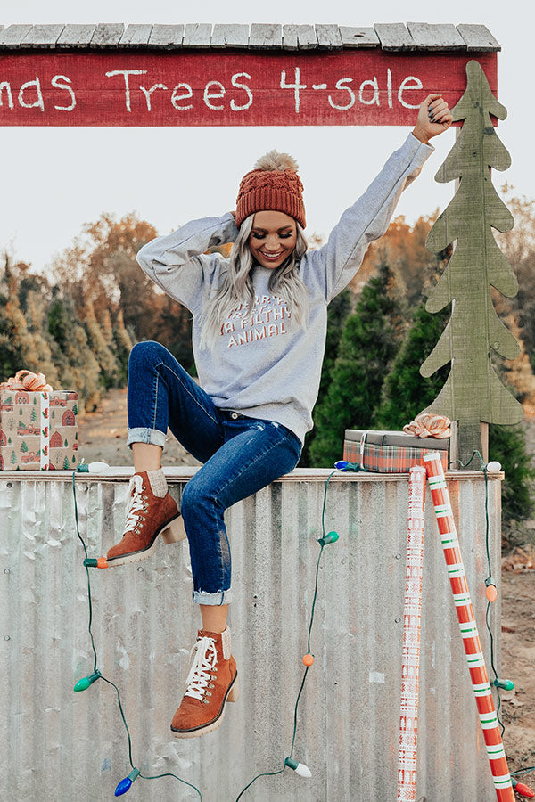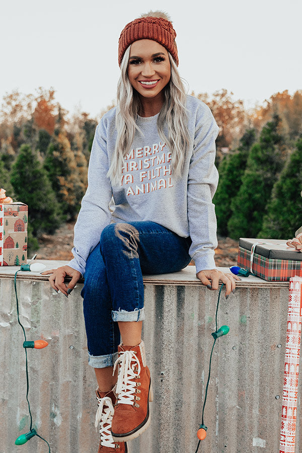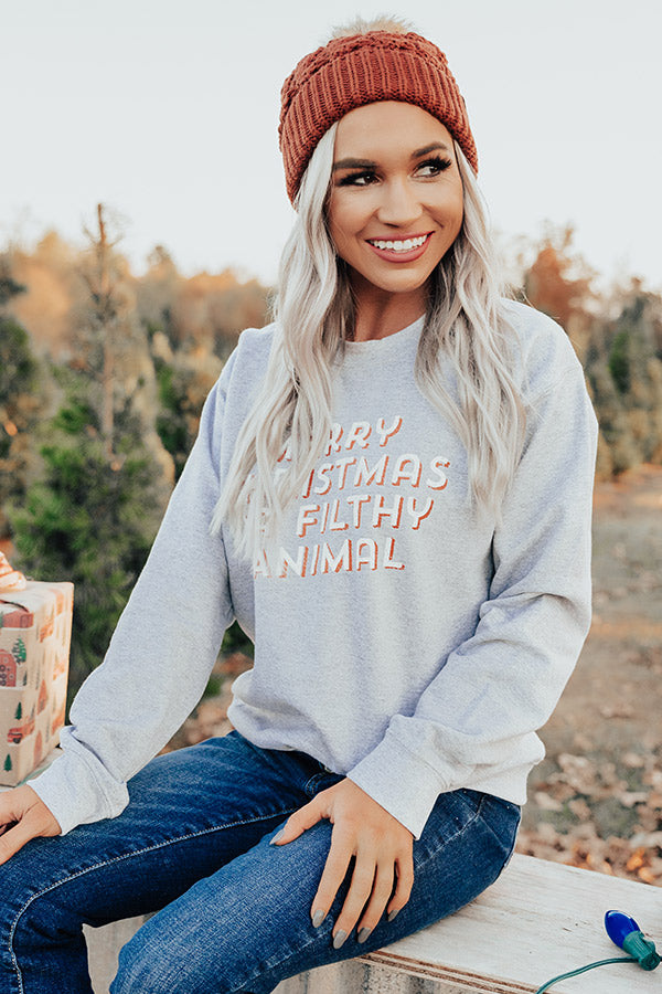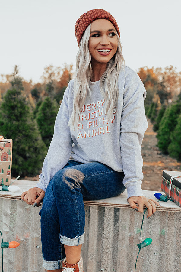 Have a Merry Christmas in our festive grey 'Ya Filthy Animal' sweatshirt featuring soft and warm lightweight material with adorable red and white block lettering on the front, a high rounded neckline, long loose sleeves with fitted cuffs, and a slouched silhouette that ends in a straight hemline!