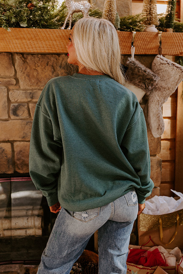 Feel the joy in our green 'Merry Graphic Sweatshirt'! Features a lightweight cotton and polyester material, patterned with a bright red and gold tracing print, a round neckline, long loose sleeves with fitted cuffs, and a relaxed silhouette that falls into a straight hemline.