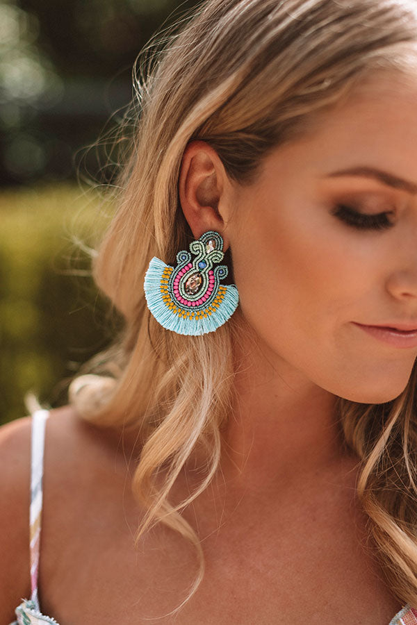 These glamorous earrings will give you a met gala moment with their crystal studs surrounded by blue embroidery that cascades into pink embroidery surrounded by colorful crystal beads and an even larger blue tassel fan!