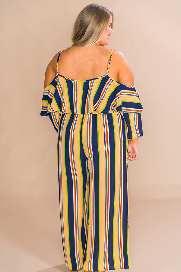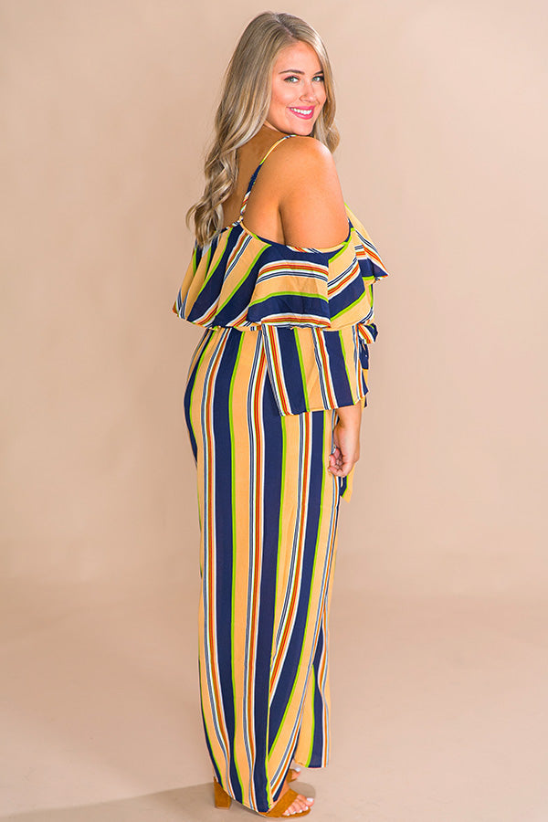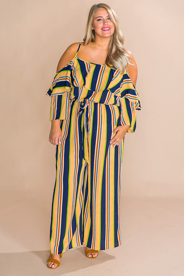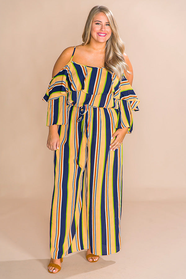 Create moments that will last a lifetime in this chic striped jumpsuit! The "Met Gala Moment Stripe Jumpsuit" has thin adjustable straps that fall into a quarter-length cold-shoulder sleeve, a flirty flounced neckline, and a sash belted elastic waist that falls into a breezy wide-cut pant.