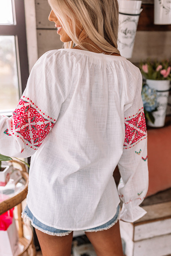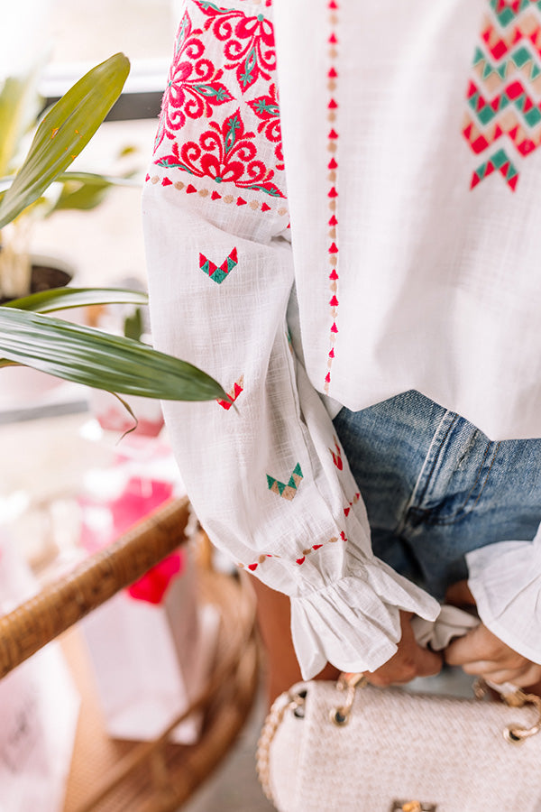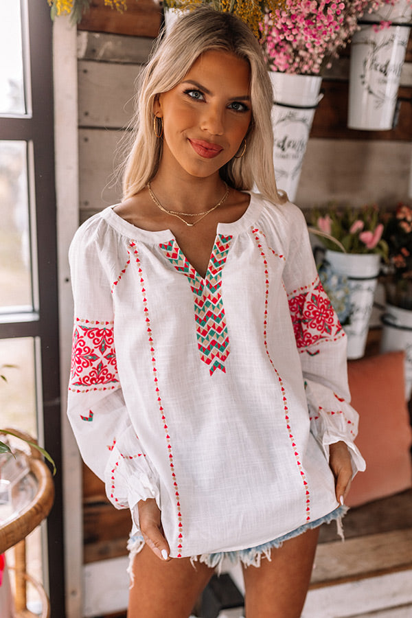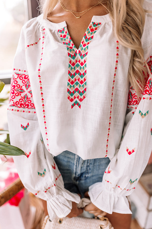 Live life colorfully in our adorable white 'Mezcal Margs' top featuring lightweight material with intricate colorful embroidered detailing, a rounded neckline with a v-notch, long bishop sleeves with subtly flared cuffs, and a relaxed silhouette that falls into a straight hemline!