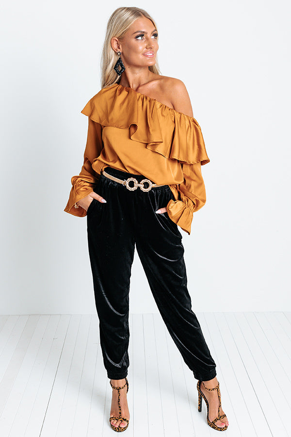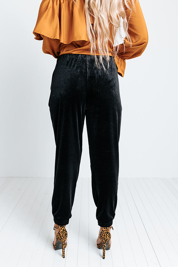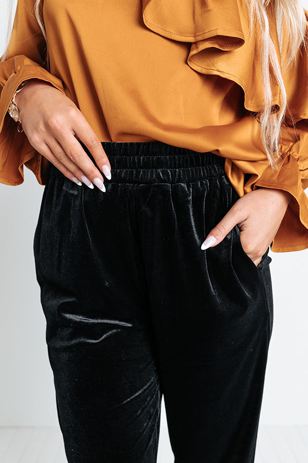 May all your midnight dreams come true when you wear these gorgeous black joggers featuring soft velvet material, a comfortable elastic waistline, hidden side pockets, and a slouched pants silhouette that tapers into fitted ankle-length hemlines! Measurements