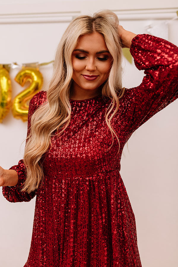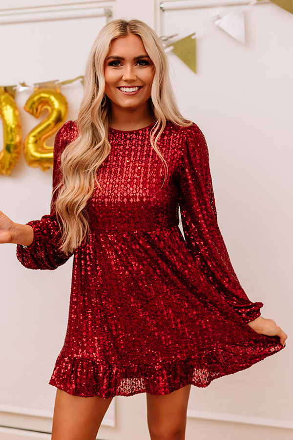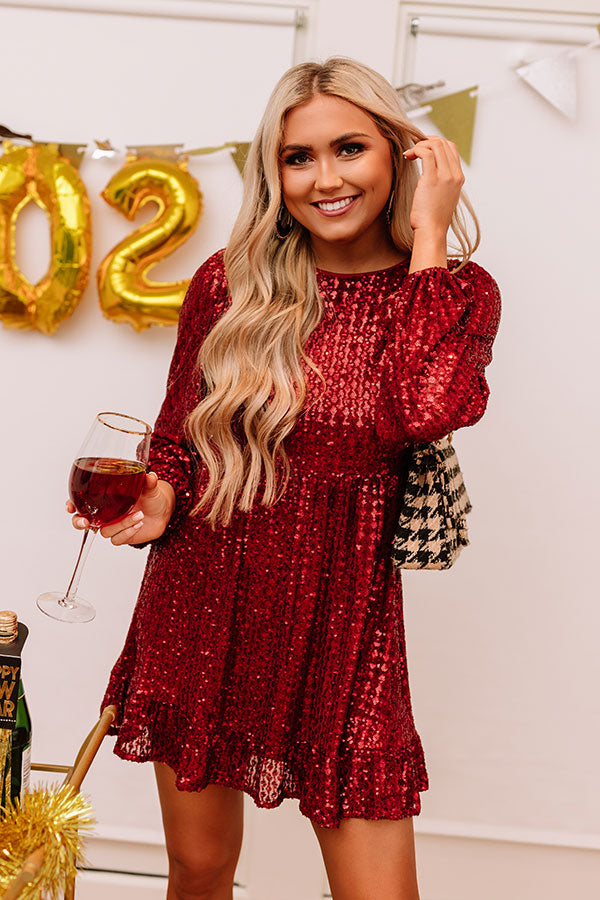 Toast to the new year in style with this gorgeous crimson colored dress featuring lightweight flowy material covered in shimmering sequins, a high rounded neckline, long oversized sleeves with elastic band cuffs, a zip closure back, and an ultra relaxed silhouette that cascades into a peplum bottom with an uneven mid-thigh length hemline! Measurements