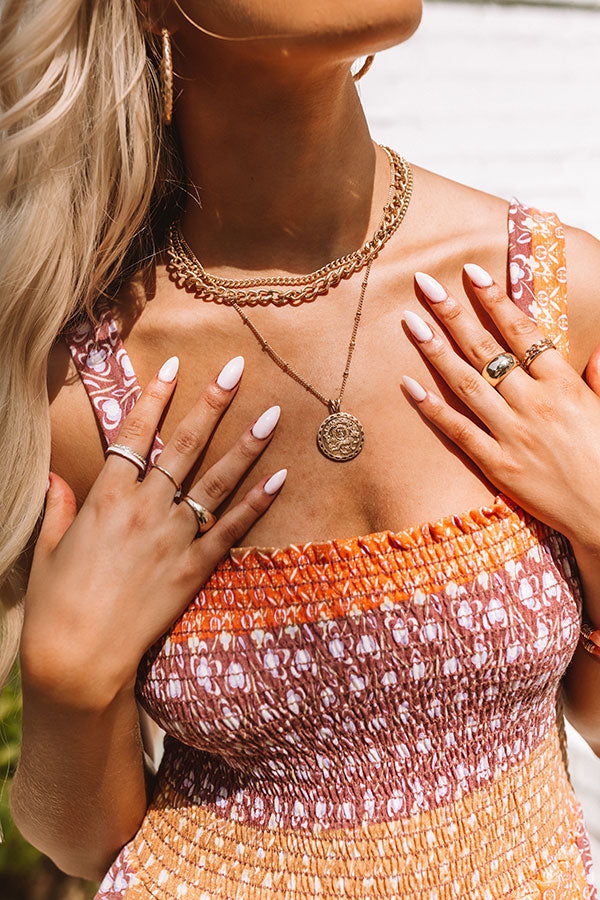 Add a bit of shine to any look by accessorizing with our gold 'Midnight Train' featuring three layered pieces: a small link choker, a larger link medium length chain, and a long dainty chain with a coin pendant!