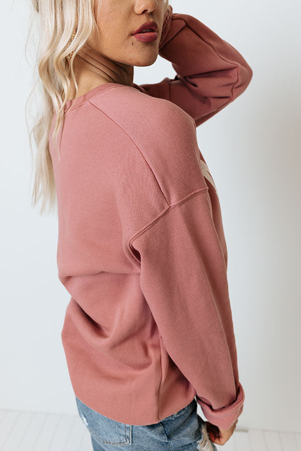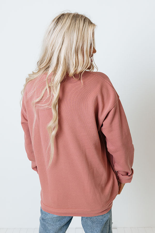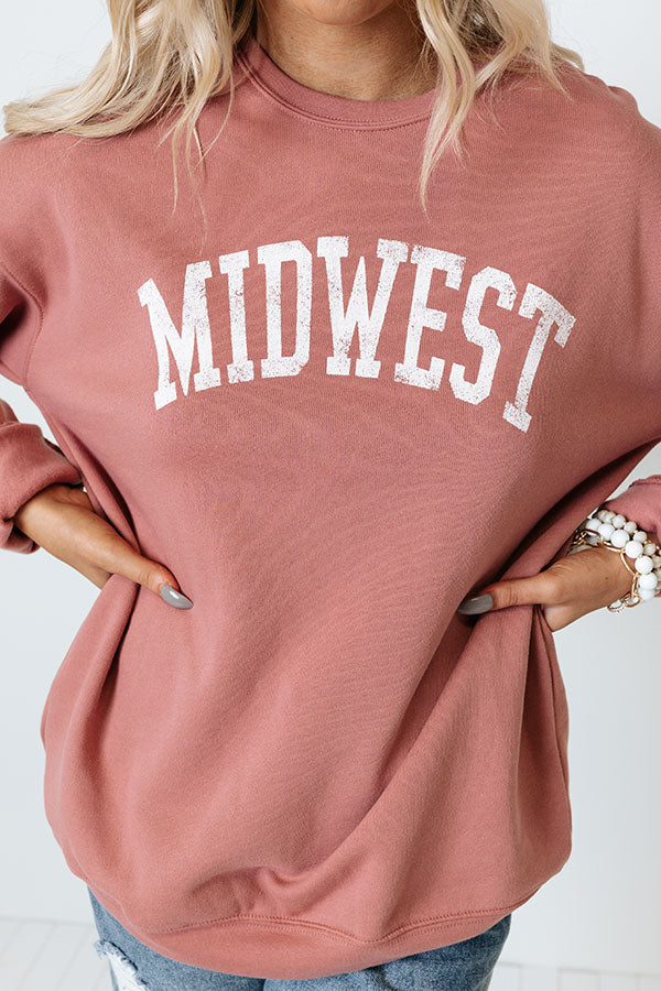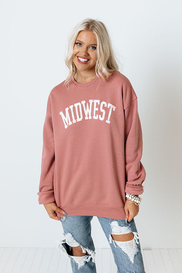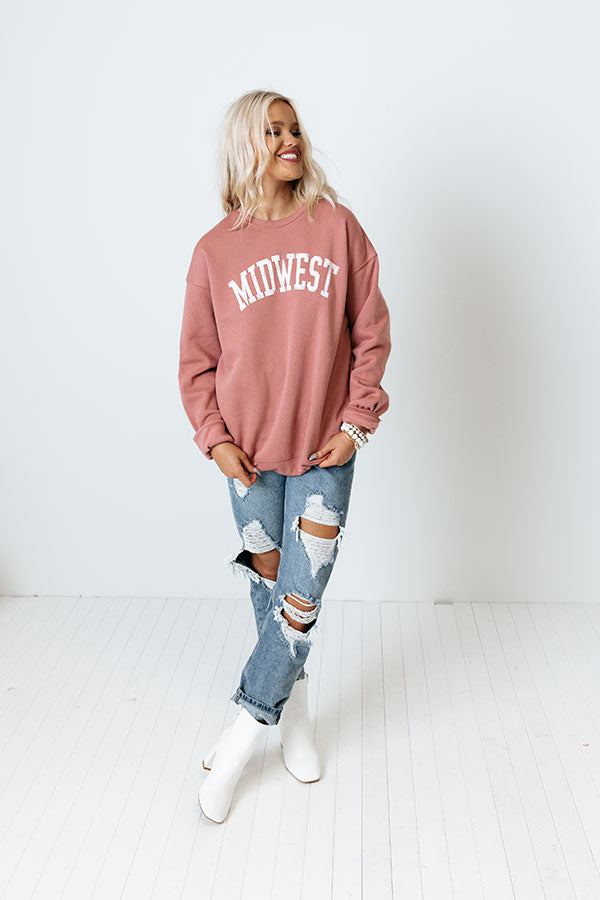 Keep it casual but comfy in our blush hued 'Midwest' sweatshirt featuring soft and warm material with large white lettering on the front, a rounded neckline, long loose sleeves, and a slouched silhouette that ends in a straight hemline! Measurements