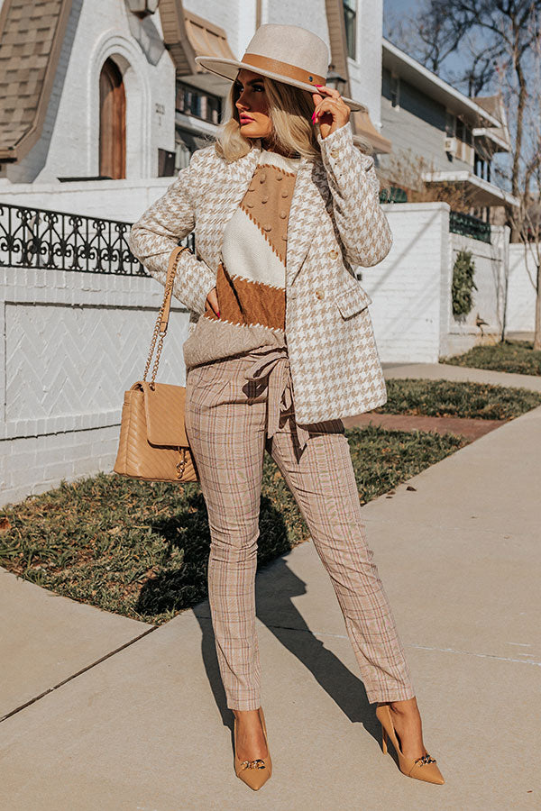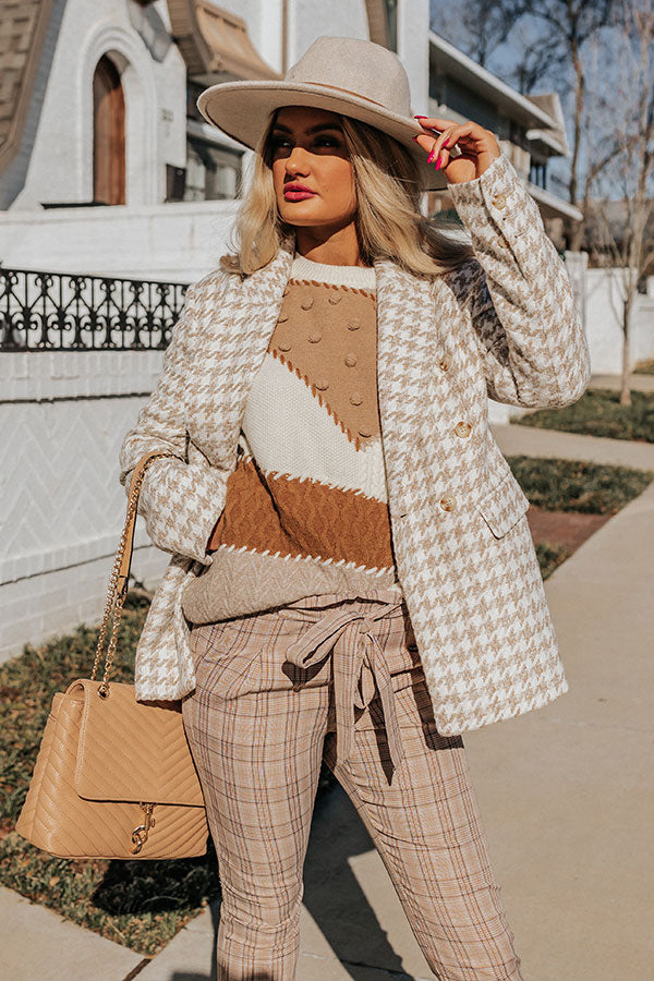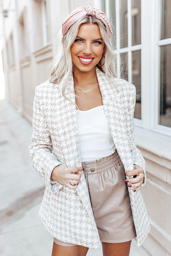 You will look like the ultimate girl boss when you complete your look with our classy white 'Milan Hopes' blazer featuring a light taupe hued houndstooth print, long loose sleeves, three accent buttons down the front, two low pockets with flap closures, a collared neckline, and a relaxed but sophisticated silhouette that ends in a straight hemline! Measurements