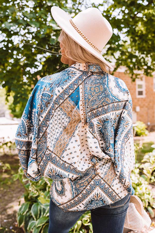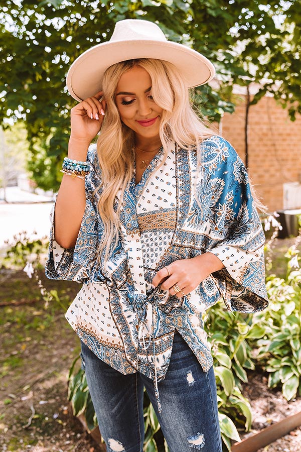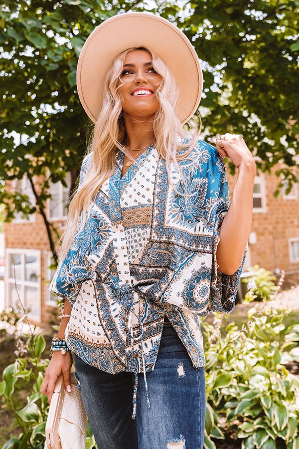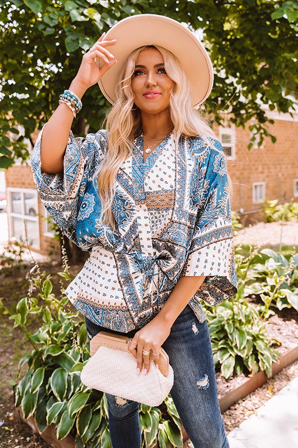 Put together an eye-catching look with our unique 'Miles And Memories' top featuring lightweight and breezy satin material patterned with a variety of blue and natural hued baroque patchwork prints, a wrap bodice with a side tie closure and v-cut neckline, loose 3/4-length sleeves, and a relaxed silhouette that ends in a straight hemline!