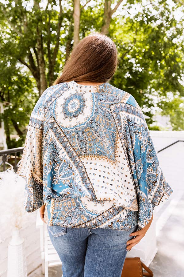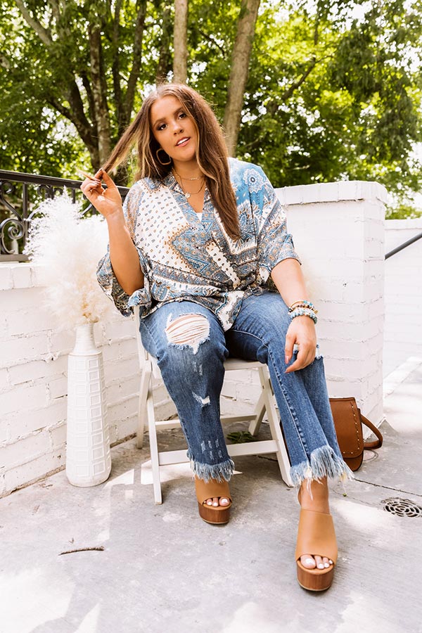 Plus Size - Put together an eye-catching look with our unique 'Miles And Memories' top featuring lightweight and breezy satin material patterned with a variety of blue and natural hued baroque patchwork prints, a wrap bodice with a side tie closure and v-cut neckline, loose 3/4-length sleeves, and a relaxed silhouette that ends in a straight hemline!