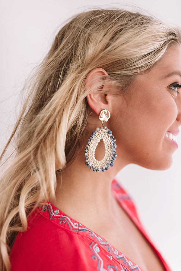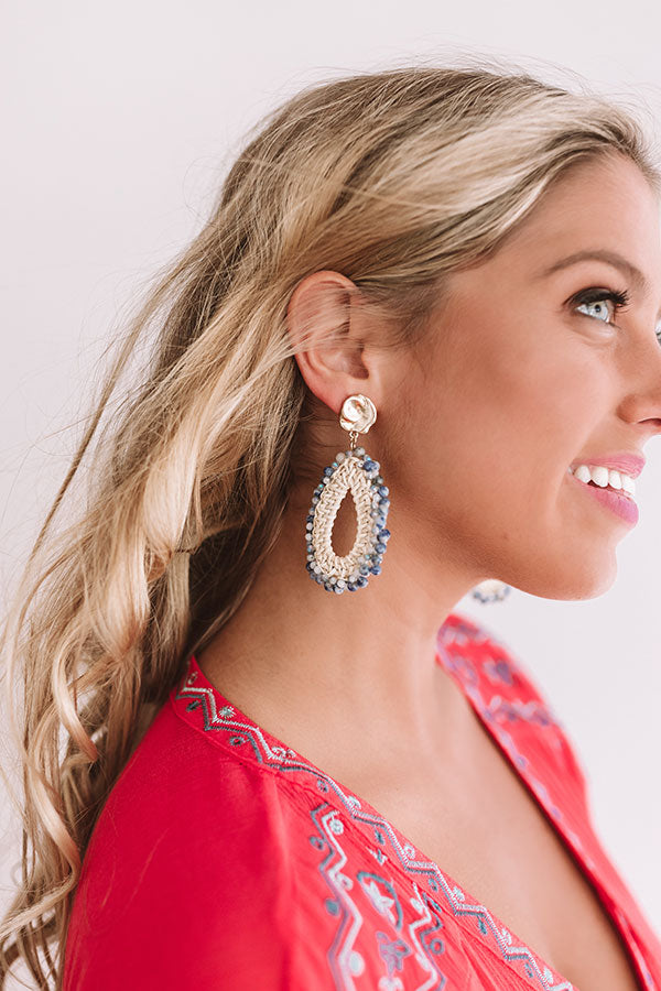 These earrings are as sweet as mimosa kisses with their golden plate stud attached to a teardrop shaped woven hoop and blue beaded outside!