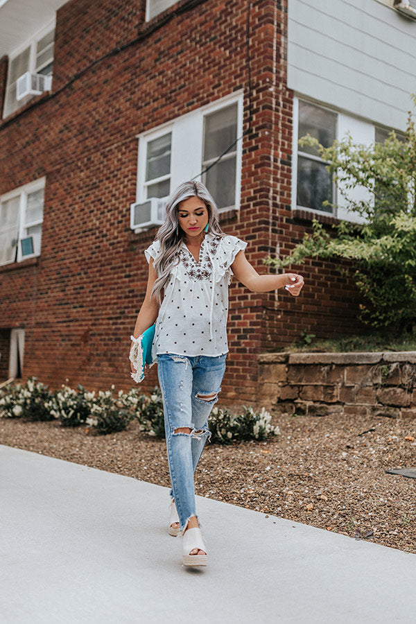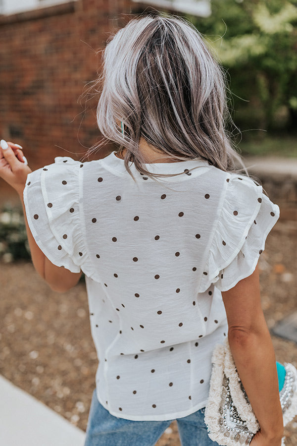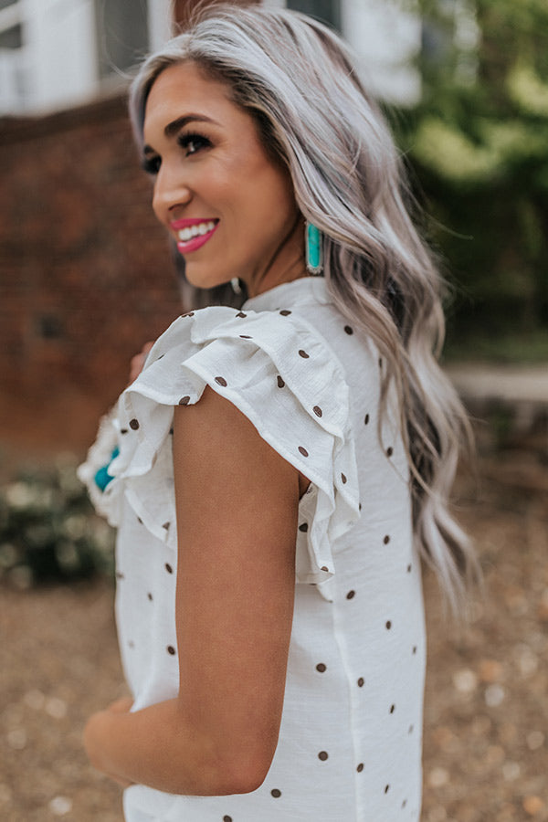 Add a touch of magic to your spring wardrobe with this darling ivory hued top featuring lightweight flowy material patterned with brown polka dots and floral embroidery, a v-cut neckline with a tie closure, tiered ruffled cap sleeves, and a relaxed silhouette that falls into a straight hemline! Measurements