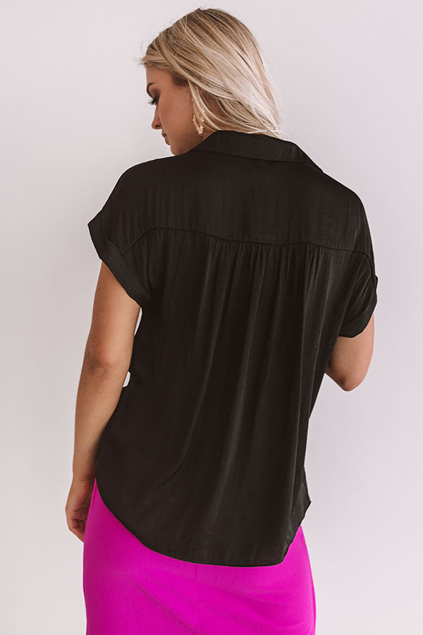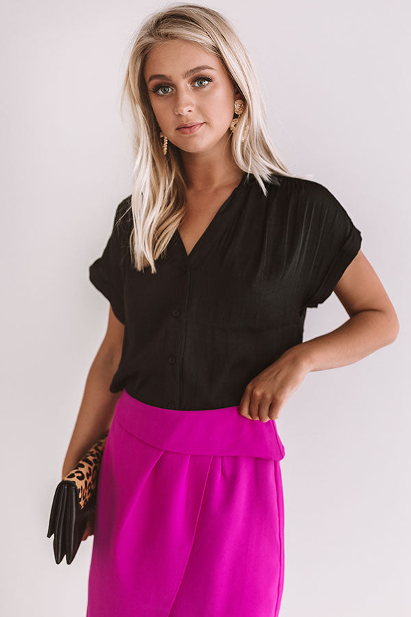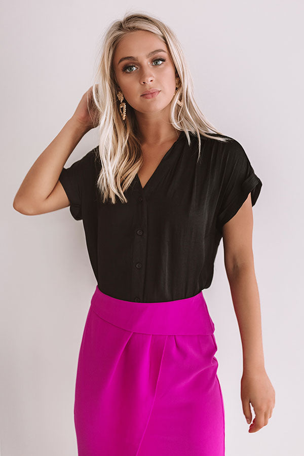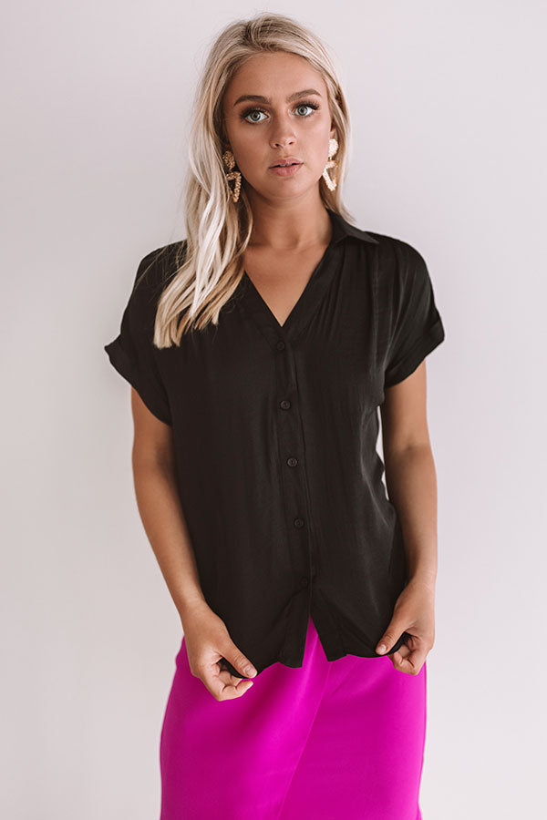 This black shift top will have you asking "mimosa please" with its button down bodice, collared v-neck, short cuffed sleeves, a rounded hemline, and a loose lightweight fit with subtle pleated detailing in the back! You can style this piece for vacation with some distressed white skinnies, sunnies, and a neutral wedge, for the office with a pink pencil skirt, a clutch, and leopard heel, or for some weekend activities with distressed jean shorts, a hair scarf, and sandals! Measurements