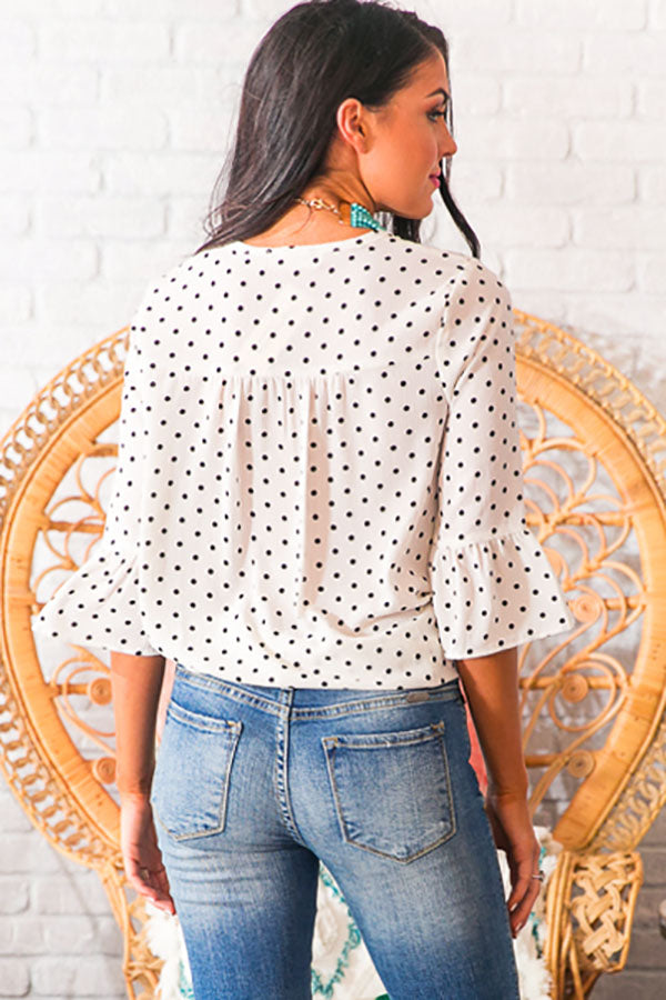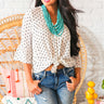 The "Mimosa Sipping Polka Dot Shift Top" has DOT it going on! This posh polka dot top has quarter-length sleeves with a flirty flounced cuff, and a relaxed button down poly bodice that can be un-buttoned & tied at the hem. Style with your favorite denim & a colorful statement earring for a chic put-together look in minutes!