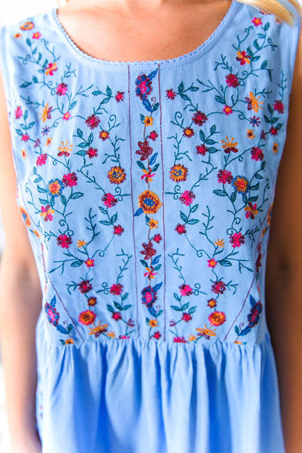 Sit back and sip a mimosa in Mexico in this breezy boho babe! This sleeveless sweetie has a gorgeous floral embroidered bodice, keyhole accented upper back with button closure, and a relaxed ruffled hem with floral stitched trim. Style this babydoll beauty with your favorite cut-off shorts for a sweet summer look with the perfect boho flair!