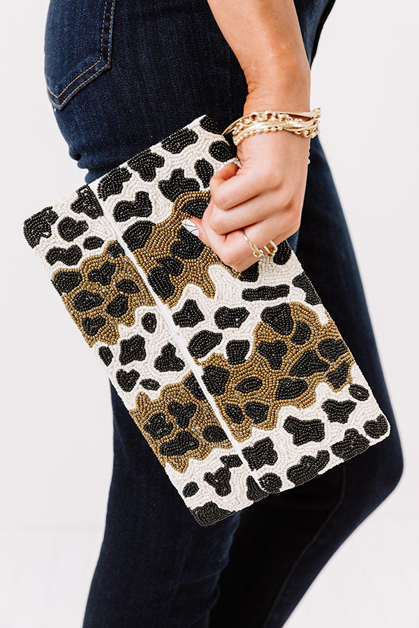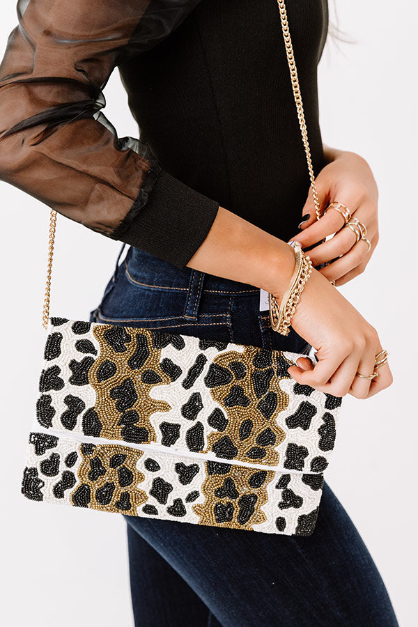 This gorgeous clutch is sure to bring a smile to your face with its beaded black, white, and gold leopard print material, a removable gold chain link shoulder straps, and a lightweight rectangular silhouette with a flap closure and an additional inside pocket!